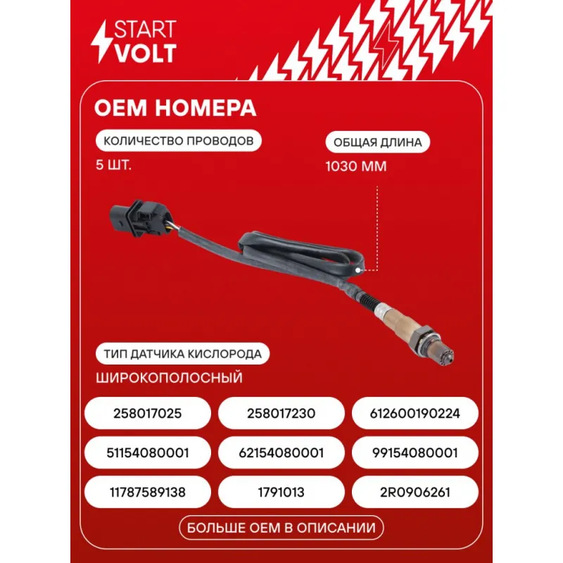 Датчик кислорода для автомобилей BMW 5 F10 (10-) 2.5i/3.0i/X3 F25 (10-) 3.0i до катализатора аналог 0258017025 Характеристики: Артикул: VS-OS 3139 OEM номера: 11787589138, 1791013, 2R0906261, 51154080001, 62154080001, 99154080001, 0258017025, 0258017230, 612600190224, D430038231L0A Общая длина, мм: 1030 Количество проводов: 5 Тип датчика кислорода: Широкополосный Количество на автомобиль: 1 Комплектация: Датчик кислорода - 1 шт Паспорт изделия/гарантийный талон - 1 шт Гарантия: от 1 года.