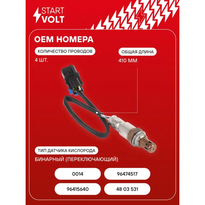Датчик кислорода для автомобилей Chevrolet Captiva (06-) 2.4i/Spark (05-) 0.8i после катализатора Характеристики: Артикул: VS-OS 0553 OEM номера: 96415640, 48 03 531, 0014, 96474517 Количество на автомобиль: 1 Тип датчика кислорода: Бинарный (переключающий) Общая длина, мм: 410 Количество проводов: 4 Подходит для авто: Opel Antara (06-) Chevrolet Spark (05-), Captiva (06-) Daewoo Matiz (98-) Для проверки применяемости отправьте VIN автомобиля через вкладку "Есть вопросы о товаре?" Комплектация: Датчик кислорода - 1 шт Паспорт изделия/гарантийный талон - 1 шт Гарантия: от 1 года.