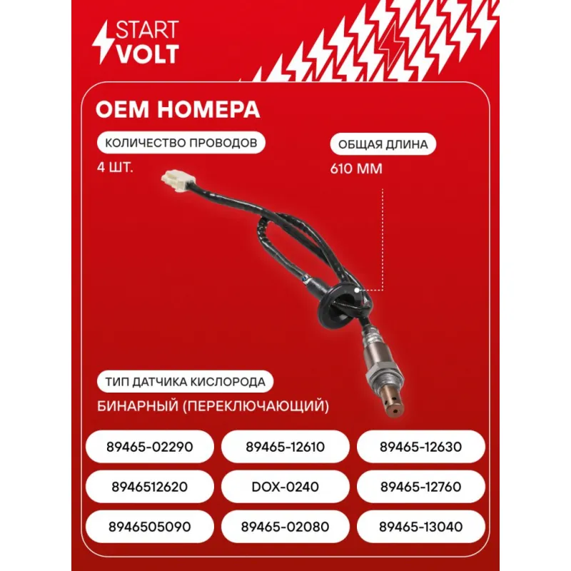 Датчик кислорода для автомобилей Toyota Corolla (00-)/Avensis (03-) 1.6i/1.8i Характеристики: Артикул: VS-OS 1914 OEM номера: 8946505090, 89465-02080, 89465-13040, 8946512620, DOX-0240, 89465-12760, 89465-02290, 89465-12610, 89465-12630 Количество на автомобиль: 1 Тип датчика кислорода: Бинарный (переключающий) Общая длина, мм: 610 Количество проводов: 4 Подходит для авто: Toyota Corolla E120 (01-), Avensis (03-) Для проверки применяемости отправьте VIN автомобиля через вкладку "Есть вопросы о товаре?" Комплектация: Датчик кислорода - 1 шт Паспорт изделия/гарантийный талон - 1 шт Гарантия: от 1 года.