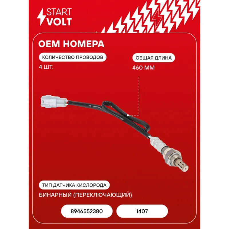 Датчик кислорода для автомобилей Toyota Corolla (06-) 1.5i/Yaris (99-) 1.3i до катализатора Характеристики: Артикул: VS-OS 2816 OEM номера: 8946552380, F 00H L00 348, 1407 Общая длина, мм: 460 Количество проводов: 4 Тип датчика кислорода: Бинарный (переключающий) Количество на автомобиль: 1 Комплектация: Датчик кислорода - 1 шт Паспорт изделия/гарантийный талон - 1 шт Гарантия: от 1 года.