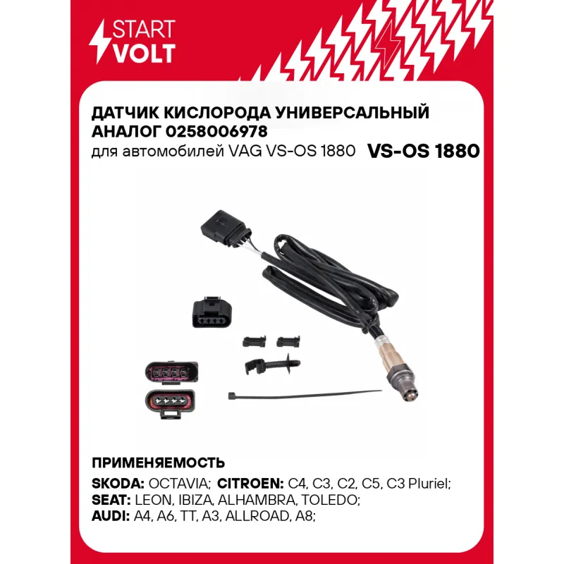 Датчик кислорода универсальный аналог 0258006978 для автомобилей VAG Характеристики: Артикул: VS-OS 1880 OEM номера: YM219 F472 CA, YM219 F472 GA, 023906262, 030906262, 006A906262P, 021906262C, 030 906 262 A, 058906265B, 078906265T, 1K0 998 262, 077906262B, 077906262C, 077906262G, 077906265AD, 077906265AE, 078906265AA, 06C906265, 06C906265A, 06C 906 265 C, 06C906265E, 07C 906 262 E, 07C 906 262 F, 06A 906 262 BA, 06A906262G, 06A906262P, 06A906262Q, 06A906265M, 06B 906 265 C, 058906265C, 06A 906 262 AC, 06A906262AG, 06A906262AK, 06A906262AL, 06A 906 262 B, 0258006978, 0258006039, 0258006161, 0258006163, 0258006219, 0258006221, 0258006527, 0258006535, 0258006582, 0258006584, 0258006609, 0 258 986 603, 0258006361, 0258006363, 0258006442, 0258006444, 0258006465, 0258006525, 0258006239, 0258006243, 0258006247, 0258006259, 0258006261, 0258006296 Количество на автомобиль: 1 Тип датчика кислорода: Бинарный (переключающий) Общая длина, мм: 1790 Количество проводов: 4 Сопротивление нагревателя, Ом: 9 Комплектация: Корпус разъема - 1 шт Хомут пластиковый - 1 шт Паспорт изделия/гарантийный талон - 1 шт Втулка пластиковая состовная из 2 частей - 2 шт Датчик кислорода - 1 шт Клипса пластиковая - 1 шт Гарантия: от 1 года.
