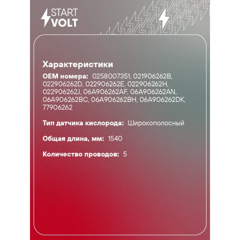 Датчик кислорода универсальный аналог 0258007351 для автомобилей VAG Характеристики: Артикул: VS-OS 0005 OEM номера: 0258007351, 021906262B, 022906262D, 022906262E, 022906262H, 022906262J, 06A906262AF, 06A906262AN, 06A906262BC, 06A906262BH, 06A906262DK, 77906262, 077906262A, 077906262D, 077906262E, 077906265AB, 077906265AC, 07C906262AS, 07C906262AT, 07C906262K, 07C906262N, 07C906262R, 1K0998262D, 077 906 262 Количество на автомобиль: 1 Тип датчика кислорода: Широкополосный Общая длина, мм: 1540 Количество проводов: 5 Сопротивление нагревателя, Ом: 3,2 Комплектация: Датчик кислорода - 1 шт Втулка пластиковая состовная из 2 частей - 4 шт Держатель пластиковый - 1 шт Паспорт изделия/гарантийный талон - 1 шт Клипса пластиковая - 1 шт Гарантия: от 1 года.