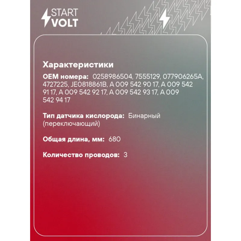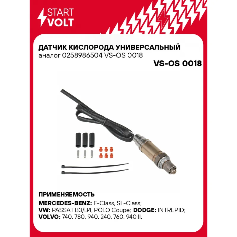 Датчик кислорода универсальный аналог 0258986504 Характеристики: Артикул: VS-OS 0018 OEM номера: 0258986504, 7555129, 077906265A, 4727225, JE0818861B, A 009 542 90 17, A 009 542 91 17, A 009 542 92 17, A 009 542 93 17, A 009 542 94 17, 009 542 90 17, 009 542 91 17, 009 542 92 17, 009 542 93 17, 009 542 94 17, 2269030P00, 2269040P10, 2269048P00, 18213 56B00 000, 18213-56B00, 1346738, 1346962, 1378123, 3501753, 3531251, 3531400, 9135793, 025906265B, 034906265D, 77906265, 35906265D Количество на автомобиль: 1 Тип датчика кислорода: Бинарный (переключающий) Общая длина, мм: 680 Количество проводов: 3 Сопротивление нагревателя, Ом: 2,1 Комплектация: Втулка металлическая - 3 шт Паспорт изделия/гарантийный талон - 1 шт Датчик кислорода - 1 шт Резиновая втулка - 6 шт Инструкция по установке - 1 шт Термоусадка - 3 шт Пластиковый хомут - 2 шт Гарантия: от 1 года.