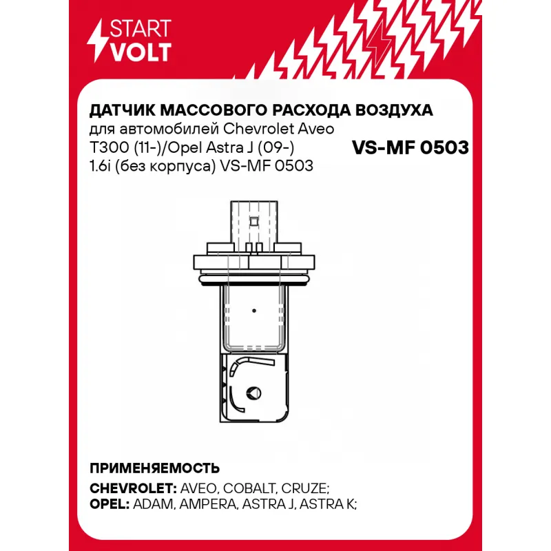 Датчик массового расхода воздуха для автомобилей Chevrolet Aveo T300 (11-)/Opel Astra J (09-) 1.6i (без корпуса) Характеристики: Артикул: VS-MF 0503 OEM номера: 0836006, 13301682, 92196278, 20895955, 12671616, 0280218429, 0 280 218 254 Количество контактов: 5 Тип корпуса: Без корпуса Количество на автомобиль: 1 Комплектация: Датчик массового расхода воздуха - 1 шт Паспорт изделия/гарантийный талон - 1 шт Гарантия: от 1 года.