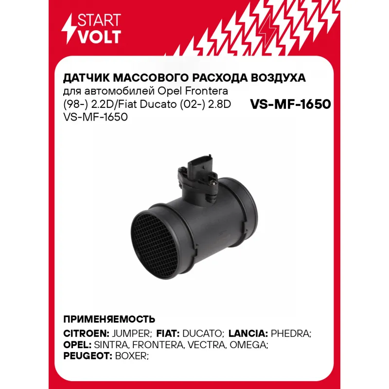 Датчик массового расхода воздуха для автомобилей Opel Frontera (98-) 2.2D/Fiat Ducato (02-) 2.8D Характеристики: Артикул: VS-MF-1650 OEM номера: 1192W5, 13243690 , 1324369080, 717359980, 46444287, K1324369080, 60815616, 504051082, 500332364, 0281002184, 028021807A, 836593, 9193533, 90528435, 93171760, 09193533 Количество контактов: 5 Тип корпуса: С корпусом Впускной диаметр, мм: 79 Выпускной диаметр, мм: 79 Количество на автомобиль: 1 Комплектация: Датчик массового расхода воздуха - 1 шт Паспорт изделия/гарантийный талон - 1 шт Гарантия: от 1 года.