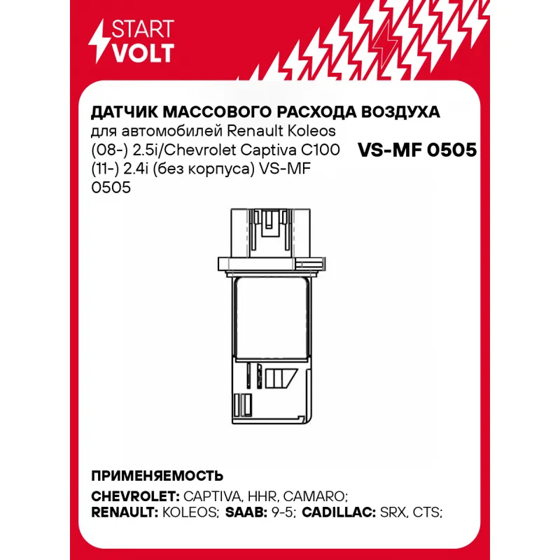 Датчик массового расхода воздуха для автомобилей Renault Koleos (08-) 2.5i/Chevrolet Captiva C100 (11-) 2.4i (без корпуса) Характеристики: Артикул: VS-MF 0505 OEM номера: 15865791, 4812876, 15865791, 12576410 Количество контактов: 5 Тип корпуса: Без корпуса Количество на автомобиль: 1 Комплектация: Датчик массового расхода воздуха - 1 шт Паспорт изделия/гарантийный талон - 1 шт Гарантия: от 1 года.