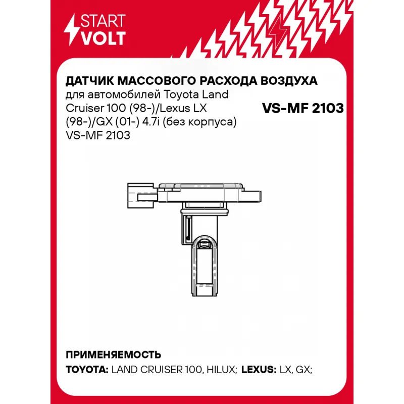Датчик массового расхода воздуха для автомобилей Toyota Land Cruiser 100 (98-)/Lexus LX (98-)/GX (01-) 4.7i (без корпуса) Характеристики: Артикул: VS-MF 2103 OEM номера: 222040F010, 2220475020 Количество контактов: 5 Тип корпуса: Без корпуса Количество на автомобиль: 1 Комплектация: Датчик массового расхода воздуха - 1 шт Паспорт изделия/гарантийный талон - 1 шт Гарантия: от 1 года.