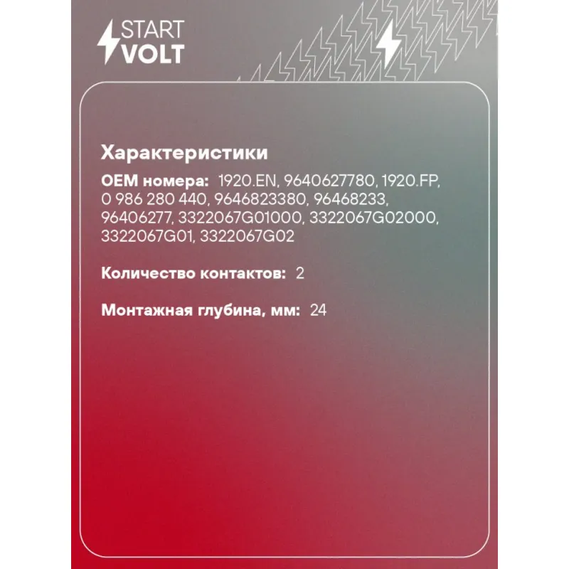 Датчик коленвала для автомобилей Citroen C5 (01-) 2.0i Характеристики: Артикул: VS-CS 2016 OEM номера: 1920.EN, 9640627780, 1920.FP, 0 986 280 440, 9646823380, 96468233, 96406277, 3322067G01000, 3322067G02000, 3322067G01, 3322067G02 Количество контактов: 2 Монтажная глубина, мм: 24 Количество на автомобиль: 1 Комплектация: Датчик положения коленвала - 1 шт Паспорт изделия/гарантийный талон - 1 шт Гарантия: от 1 года.