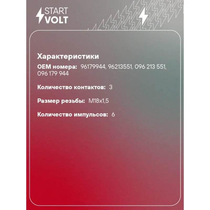 Датчик скорости для автомобилей Daewoo Nexia (94-)/Lanos (97-) 1.5i Характеристики: Артикул: VS-SP 0547 OEM номера: 96179944, 96213551, 096 213 551, 096 179 944 Количество контактов: 3 Размер резьбы: M18x1,5 Длина провода, мм: 119 Количество на автомобиль: 1 Количество импульсов: 6 Подходит для авто: Daewoo Espero (90-), Lanos (97-), Nexia (94-) Chevrolet Lanos (97-) Для проверки применяемости отправьте VIN автомобиля через вкладку "Есть вопросы о товаре?" Комплектация: Паспорт изделия/гарантийный талон - 1 шт Датчик скорости - 1 шт Гарантия: от 1 года.