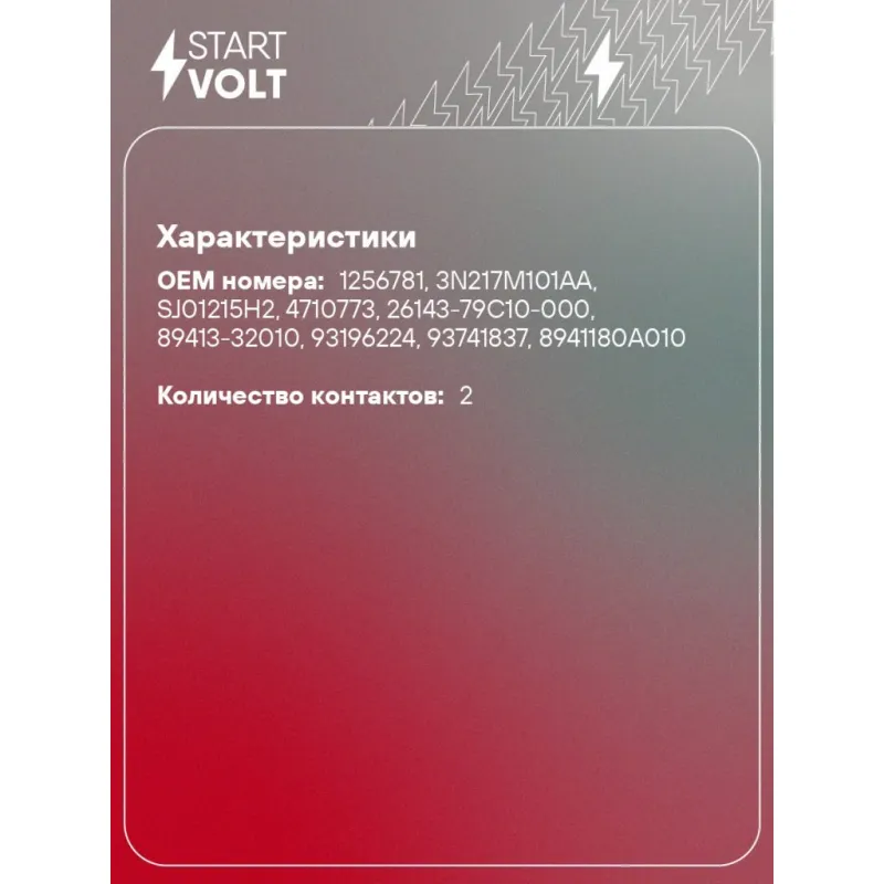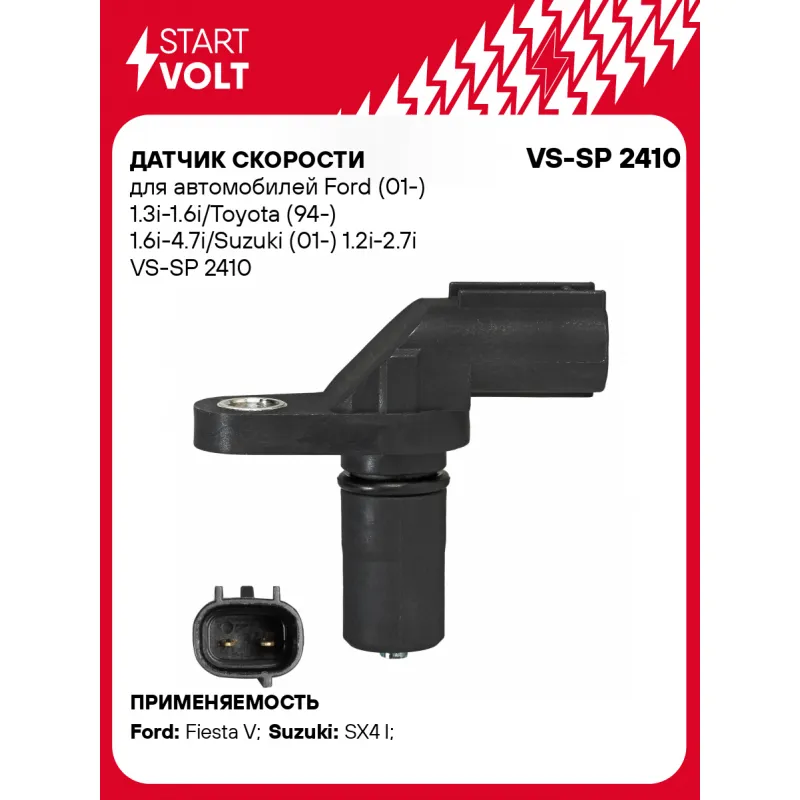 Датчик скорости для автомобилей Ford (01-) 1.3i-1.6i/Toyota (94-) 1.6i-4.7i/Suzuki (01-) 1.2i-2.7i Характеристики: Артикул: VS-SP 2410 OEM номера: 1256781, 3N217M101AA, SJ01215H2, 4710773, 26143-79C10-000, 89413-32010, 93196224, 93741837, 8941180A010 Количество контактов: 2 Количество на автомобиль: 1 Подходит для авто: Ford Fiesta V (02-) Suzuki SX4 I (06-), SX4 I (06-) Для проверки применяемости отправьте VIN автомобиля через вкладку "Есть вопросы о товаре?" Комплектация: Паспорт изделия/гарантийный талон - 1 шт Датчик скорости - 1 шт Гарантия: от 1 года.