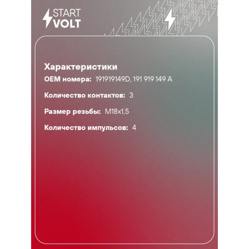 Датчик скорости для автомобилей VAG Octavia I (96-)/ Passat B3 (88-) 1.6i/1.8i/1.8T/1.9D/2.0i Характеристики: Артикул: VS-SP 1801 OEM номера: 191919149D, 191 919 149 A Количество контактов: 3 Размер резьбы: M18x1,5 Количество на автомобиль: 1 Количество импульсов: 4 Подходит для авто: Volkswagen Golf III (91-), Passat B3 (88-), Vento (92-), Polo III (94-) Skoda Octavia (96-) Для проверки применяемости отправьте VIN автомобиля через вкладку "Есть вопросы о товаре?" Комплектация: Паспорт изделия/гарантийный талон - 1 шт Датчик скорости - 1 шт Гарантия: от 1 года.