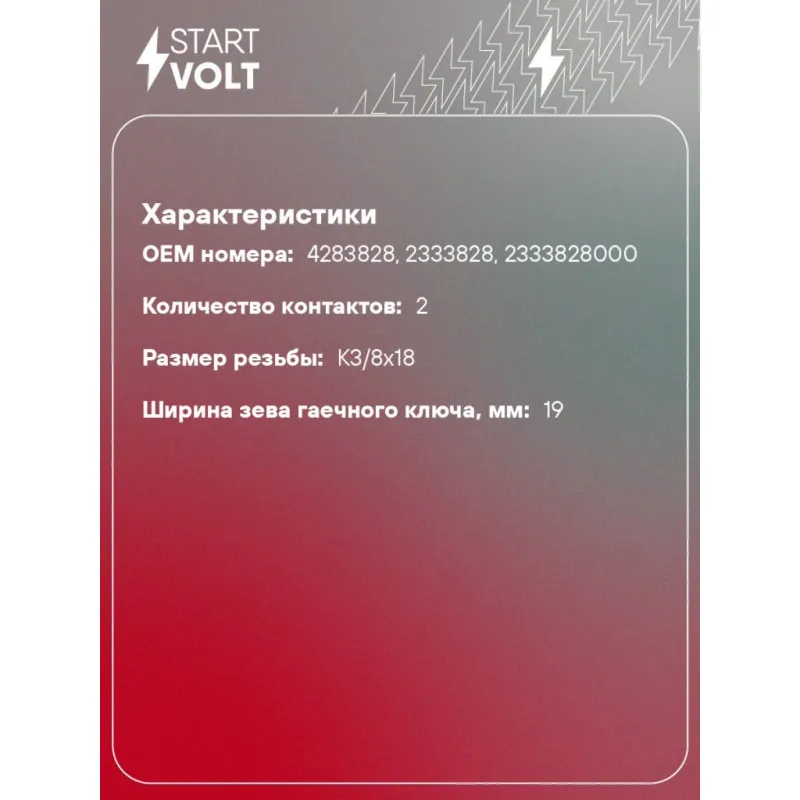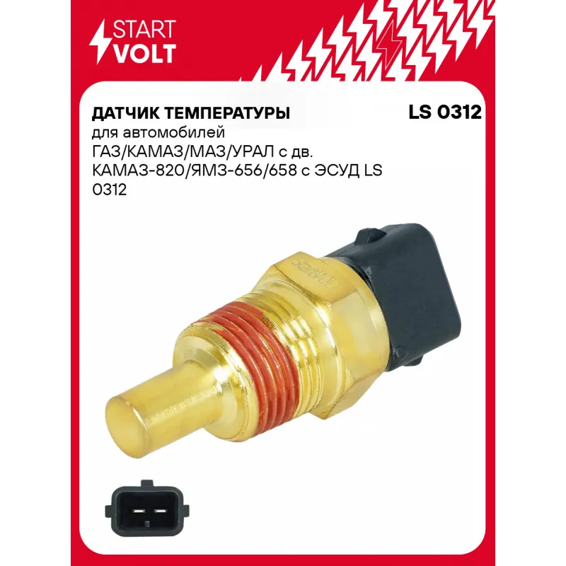 Датчик температуры для автомобилей ГАЗ/КАМАЗ/МАЗ/УРАЛ с дв. КАМАЗ-820/ЯМЗ-656/658 с ЭСУД Характеристики: Артикул: LS 0312 OEM номера: 4283828, 2333828, 2333828000 Количество контактов: 2 Размер резьбы: K3/8x18 Ширина зева гаечного ключа, мм: 19 Количество на автомобиль: 1 Комплектация: Датчик температуры - 1 шт Гарантия: от 1 года.