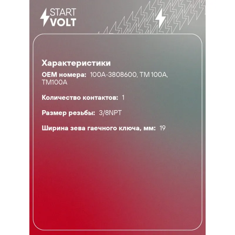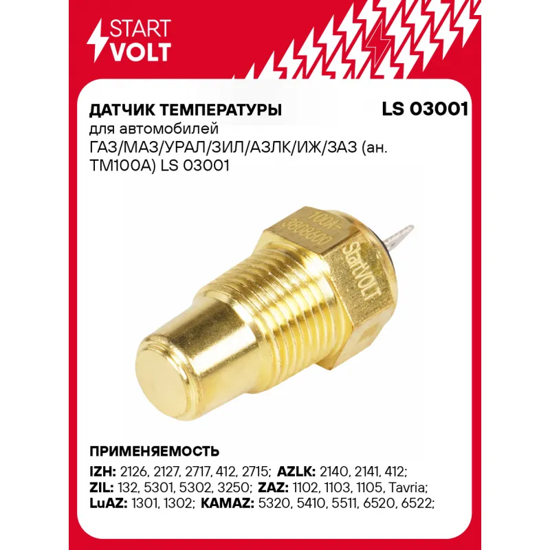 Датчик температуры для автомобилей ГАЗ/МАЗ/УРАЛ/ЗИЛ/АЗЛК/ИЖ/ЗАЗ (ан. ТМ100А) Характеристики: Артикул: LS 03001 OEM номера: 100А-3808600, ТМ 100А, TM100A Номинальное напряжение, В: 12 Количество контактов: 1 Размер резьбы: 3/8NPT Ширина зева гаечного ключа, мм: 19 Количество на автомобиль: 1 Подходит для авто: IZH 2126, 2127, 2717, 412, 2715 AZLK 2140, 2141, 412 ZIL 132, 5301, 5302, 3250 ЗАЗ 1102, 1103, 1105, Tavria ЛуАЗ 1301, 1302 КамаАЗ 5320, 5410, 5511, 6520, 6522, 4308, 4310, 4326, 5315, 53212, 54112, 55112, 55102, 55111, 4350, 5350, 6350, 6460, 65116, 65117, 65225 Для проверки применяемости отправьте VIN автомобиля через вкладку "Есть вопросы о товаре?" Комплектация: Датчик температуры - 1 шт Гарантия: от 1 года.