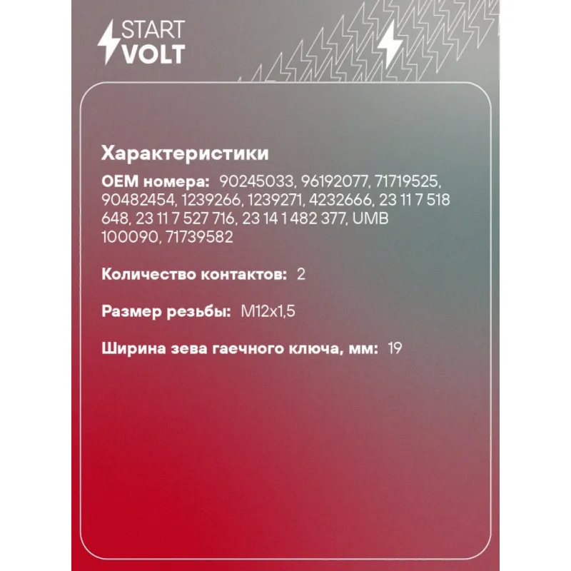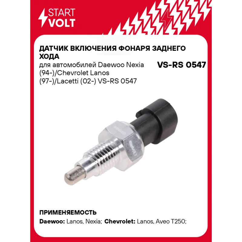 Датчик включения фонаря заднего хода для автомобилей Daewoo Nexia (94-)/Chevrolet Lanos (97-)/Lacetti (02-) Характеристики: Артикул: VS-RS 0547 OEM номера: 90245033, 96192077, 71719525, 90482454, 1239266, 1239271, 4232666, 23 11 7 518 648, 23 11 7 527 716, 23 14 1 482 377, UMB 100090, 71739582, 71740080, 7 527 716, 88893293, 225756, 9509824, 71740022, 71745445, 73503780, 1148056, 99660610301, 7700108081, 3761084E00, 37610-84E00-000 Напряжение, В: 12 Количество на автомобиль: 1 Размер резьбы: M12x1,5 Ширина зева гаечного ключа, мм: 19 Количество контактов: 2 Подходит для авто: Daewoo Lanos (97-), Lanos (97-), Nexia (94-) Chevrolet Lanos (05-), Aveo T250 (06-), Aveo T255 (08-), Epica (06-), Aveo T200 (02-), Epica (06-), Lacetti (02-) Для проверки применяемости отправьте VIN автомобиля через вкладку "Есть вопросы о товаре?" Комплектация: Паспорт изделия/гарантийный талон - 1 шт Датчик включения фонаря заднего хода - 1 шт Гарантия: от 1 года.