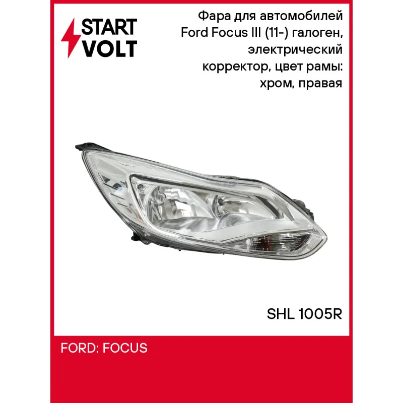 Фара для автомобилей Ford Focus III (11-) (головного света) галоген, электрический корректор, цвет рамы: хром, правая Характеристики: Артикул: SHL 1005R OEM номера: 1735190, 1 751 115, BM51-13100-AF, BM51-13100-AG Напряжение: 12В Сторона установки: Справа Тип осветительного прибора: Галоген Тип лампы/ламп: H7/H1/PY21W/W5W Оснащение (корректор): Электрический Функция осветительного прибора (ДХО/без ДХО): без ДХО Количество на автомобиль: 1 Сторона движения: правостороннее Комплектация: Фара в сборе - 1 шт Паспорт изделия - 1 шт Гарантия: от 1 года.