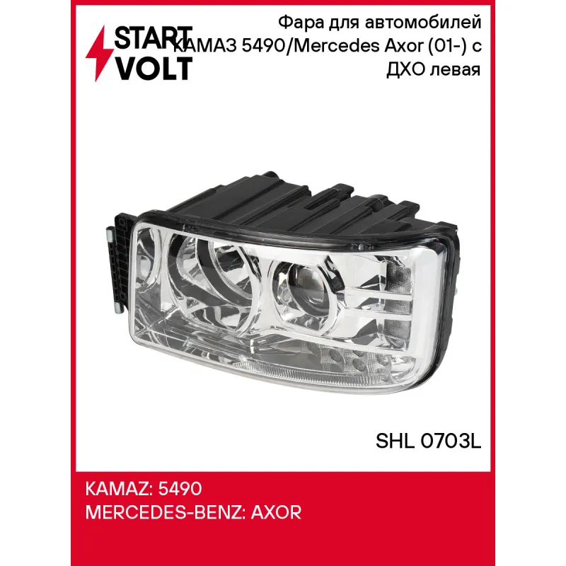 Фара для автомобилей КАМАЗ 5490/Mercedes Axor (01-) (головного света) с ДХО левая Характеристики: Артикул: SHL 0703L OEM номера: 5490-3711011, РУФС.541.00.000 Напряжение: 24B Сторона установки: Слева Тип осветительного прибора: Галоген/LED Тип лампы/ламп: H7/H1/LED Оснащение (корректор): Электрический Функция осветительного приб... Читать полностью →