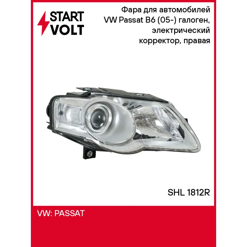 Фара для автомобилей VW Passat B6 (05-) (головного света) галоген, электрический корректор, правая Характеристики: Артикул: SHL 1812R OEM номера: 3C0941006J, 3C0 941 006 AA, 3C0 941 006 M, 3C0941006C, 3C0941006 Напряжение: 12В Сторона установки: Справа Тип осветительного прибора: Галоген Тип лампы/ламп: H7/H7/W5W Оснащение (корректор): Электрический Функция осветительного прибора (ДХО/без ДХО): без ДХО Количество на автомобиль: 1 Сторона движения: правостороннее Комплектация: Фара в сборе - 1 шт Паспорт изделия - 1 шт Гарантия: от 1 года.