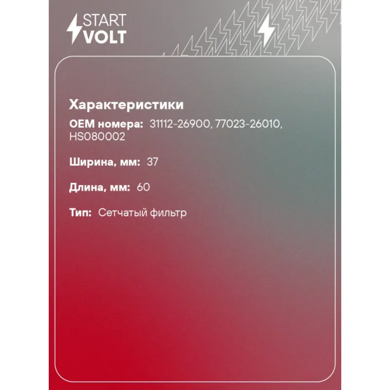 Фильтр электрического бензонасоса для автомобилей Toyota LC 100 (98-) 4.2d/Hyundai Santa Fe (02-) 2.0i Описание: Фильтр (сетка) электрического бензонасоса для автомобилей HYUNDAI SANTA FE, TOYOTA LAND CRUISER.. Сетчатый фильтр – применяется в модулях погружных электробензонасосов автомобильных двигателей с системой впрыска топлива. Предназначен для предварительной очистки топлива от сорных частиц и прочих загрязнений. Эффективная защита топливного насоса и форсунки от засорения. Фильтр грубой очистки состоит из пластикового каркаса с соединительным патрубком и сетчатого материала, натянутого на каркас. Если у вас есть вопросы по применяемости, мы всегда готовы помочь вам с подбором по VIN-НОМЕРУ ВАШЕГО АВТОМОБИЛЯ. Характеристики: Артикул: SFF 1903 OEM номера: 31112-26900, 77023-26010, HS080002 Количество на автомобиль: 1 Тип: Сетчатый фильтр Длина, мм: 60 Ширина, мм: 37 Диаметр, мм: 8 Комплектация: Фильтр-сетка - 1 шт Гарантия: от 1 года.