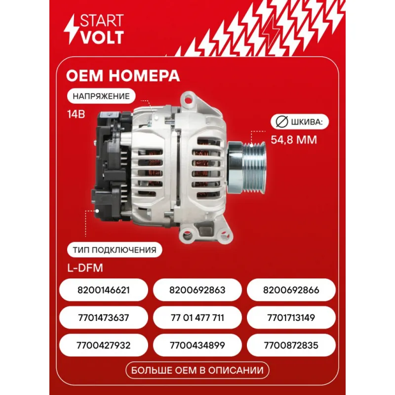 Генератор для автомобилей Renault Clio Symbol (00-)/Kangoo (97-) 1.4i 90A Описание: Оригинальный генератор STARTVOLT LG 0922 рассчитан на ток 90 А и напряжение 14 В. Изготовлен аналогично оригинальной конструкции. с многоручейковым ручейковым шкивом шкив (6PK, диаметр 54,8 мм) полностью совместим с оригинальными агрегатами. Подходит для автомобилей: DACIA LOGAN, RENAULT LOGAN, CLIO SYMBOL / THALIA, SCENIC, MEGANE, KANGOO, CLIO.. Если у вас есть вопросы по применяемости, мы всегда готовы помочь вам с подбором по VIN-НОМЕРУ ВАШЕГО АВТОМОБИЛЯ. Преимущества: - Полностью соответствует оригинальным узлам; - Высокоточная сборка с пооперационным контролем качества; - Каждый генератор проходит стендовое тестирование — протокол в комплекте; - Надёжность в любых условиях эксплуатации; - STARTVOLT 15 лет на рынке автоэлектрики — нам доверяют профессионалы; - Гарантия 2 года; - Сертифицирован по стандарту EAC (ЕАЭС) — соответствует требованиям безопасности и качества; Автомобильный генератор в сборе — готов к установке. Отличный выбор для надежной замены штатного генератора. Характеристики: Артикул: LG 0922 OEM номера: 7700427932, 7700434899, 7700872835, 7701473637, 77 01 477 711, 7701713149, 8200146621, 8200692863, 8200692866, 8253632, 0124325024, 0 124 325 031, 0124325175, 0124325184, 0 124 325 185, 0124325263 Направление вращения: По часовой стрелке Напряжение, В: 14 Вылет шкива, мм: 21 Диаметр шкива, мм: 54,8 Ременной шкив: с многоручейковым ручейковым шкивом Количество крепежных отверстий: 2 Количество канавок шкива: 6 Выходной ток, А: 90 Тип подключения: L-DFM Подходит для авто: Renault Logan (04-) Dacia Logan (04-) Для проверки применяемости отправьте VIN автомобиля через вкладку "Есть вопросы о товаре?" Комплектация: Паспорт изделия/гарантийный талон - 1 шт Индивидуальный технический паспорт изделия (с фирменным ID) - 1 шт Генератор - 1 шт Гарантия: от 1 года.