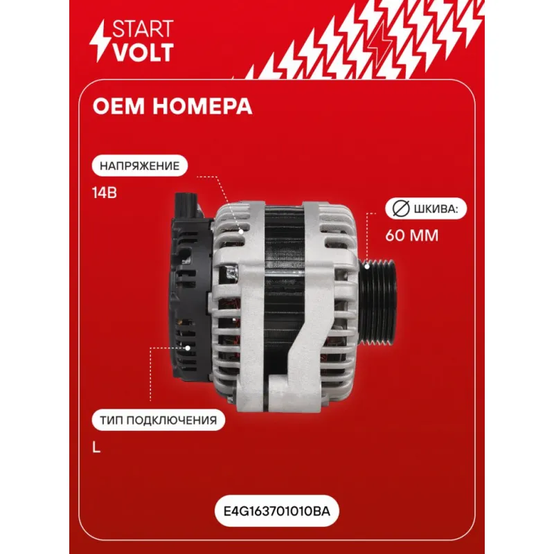 Генератор для автомобилей Chery Tiggo 3 (14-)/Tiggo 7 (16-) 1.6i/1.5T 110A Описание: Оригинальный генератор STARTVOLT LG 2717 рассчитан на ток 110 А и напряжение 14 В. Изготовлен аналогично оригинальной конструкции. с многоручейковым ручейковым шкивом шкив (6PK, диаметр 60 мм) полностью совместим с оригинальными агрегатами. Подходит для автомобилей: CHERY TIGGO 3, TIGGO, TIGGO 7.. Если у вас есть вопросы по применяемости, мы всегда готовы помочь вам с подбором по VIN-НОМЕРУ ВАШЕГО АВТОМОБИЛЯ. Преимущества: - Полностью соответствует оригинальным узлам; - Высокоточная сборка с пооперационным контролем качества; - Каждый генератор проходит стендовое тестирование — протокол в комплекте; - Надёжность в любых условиях эксплуатации; - STARTVOLT 15 лет на рынке автоэлектрики — нам доверяют профессионалы; - Гарантия 2 года; - Сертифицирован по стандарту EAC (ЕАЭС) — соответствует требованиям безопасности и качества; Автомобильный генератор в сборе — готов к установке. Отличный выбор для надежной замены штатного генератора. Характеристики: Артикул: LG 2717 OEM номера: E4G163701010BA Напряжение, В: 14 Выходной ток, А: 110 Тип подключения: L Диаметр шкива, мм: 60 Ременной шкив: с многоручейковым ручейковым шкивом Количество крепежных отверстий: 2 Количество канавок шкива: 6 Направление вращения: По часовой стрелке Вылет шкива, мм: 31 Комплектация: Генератор - 1 шт Индивидуальный технический паспорт изделия (с фирменным ID) - 1 шт Паспорт изделия/гарантийный талон - 1 шт Гарантия: от 1 года.