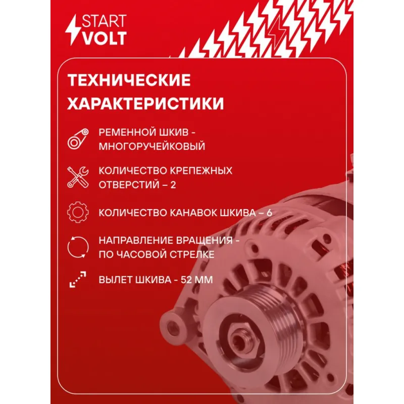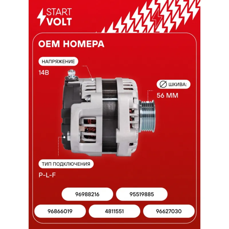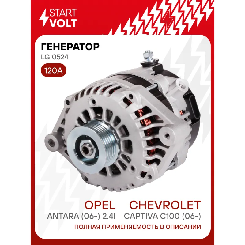 Генератор для автомобилей Chevrolet Captiva C100 (06-)/Opel Antara (06-) 2.4i 120A Описание: Оригинальный генератор STARTVOLT LG 0524 рассчитан на ток 120 А и напряжение 14 В. Изготовлен аналогично оригинальной конструкции. с многоручейковым ручейковым шкивом шкив (6PK, диаметр 56 мм) полностью совместим с оригинальными агрегатами. Подходит для автомобилей: CHEVROLET CAPTIVA, OPEL ANTARA.. Если у вас есть вопросы по применяемости, мы всегда готовы помочь вам с подбором по VIN-НОМЕРУ ВАШЕГО АВТОМОБИЛЯ. Преимущества: - Полностью соответствует оригинальным узлам; - Высокоточная сборка с пооперационным контролем качества; - Каждый генератор проходит стендовое тестирование — протокол в комплекте; - Надёжность в любых условиях эксплуатации; - STARTVOLT 15 лет на рынке автоэлектрики — нам доверяют профессионалы; - Гарантия 2 года; - Сертифицирован по стандарту EAC (ЕАЭС) — соответствует требованиям безопасности и качества; Автомобильный генератор в сборе — готов к установке. Отличный выбор для надежной замены штатного генератора. Характеристики: Артикул: LG 0524 OEM номера: 96866019, 4811551, 96627030, 96988216, 95519885 Напряжение, В: 14 Выходной ток, А: 120 Тип подключения: P-L-F Диаметр шкива, мм: 56 Ременной шкив: с многоручейковым ручейковым шкивом Количество крепежных отверстий: 2 Количество канавок шкива: 6 Направление вращения: По часовой стрелке Вылет шкива, мм: 52 Сопутствующий товар: Мосты диодные генераторов: VDB 0549 Подходит для авто: Chevrolet Captiva (06-) Opel Antara (06-) Для проверки применяемости отправьте VIN автомобиля через вкладку "Есть вопросы о товаре?" Комплектация: Генератор - 1 шт Индивидуальный технический паспорт изделия (с фирменным ID) - 1 шт Паспорт изделия/гарантийный талон - 1 шт Гарантия: от 1 года.