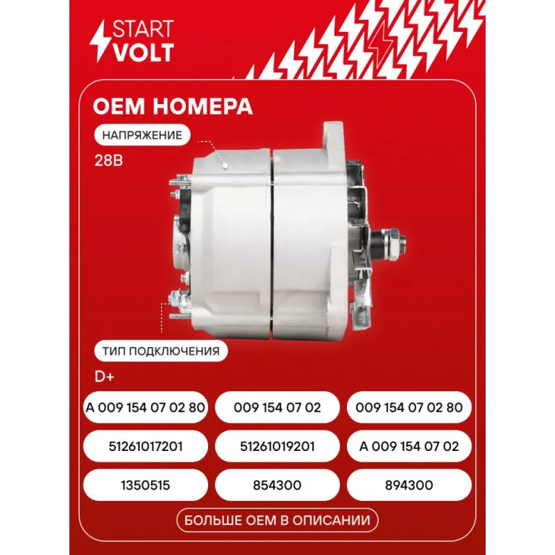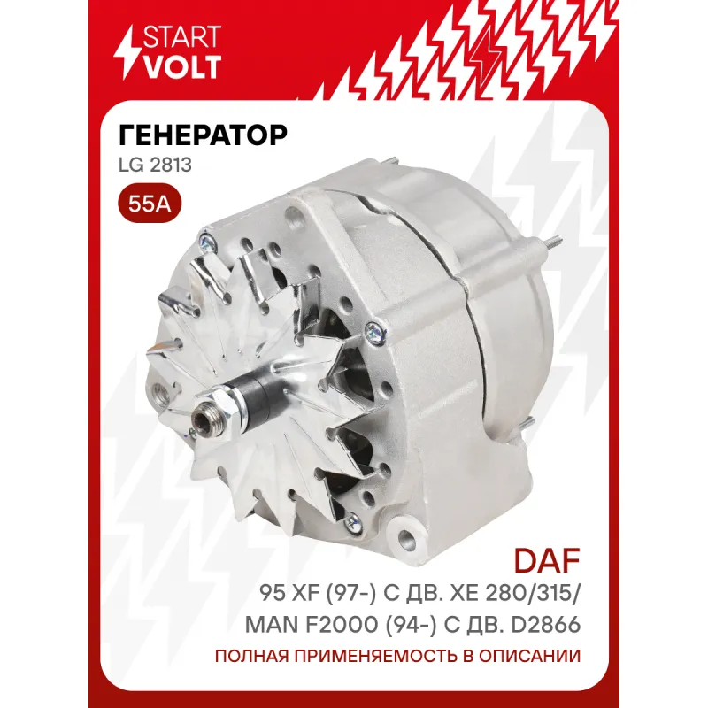 Генератор для автомобилей DAF 95 XF (97-) с дв. XE 280/315/MAN F2000 (94-) с дв. D2866 55А Описание: Оригинальный генератор STARTVOLT LG 2813 рассчитан на ток 55 А и напряжение 28 В. Изготовлен аналогично оригинальной конструкции. Полностью совместим с оригинальными агрегатами. Подходит для автомобилей: DAF 95, XF 95, 85, CF 85, 75, CF 75, CF 65, 65, 55, 45, MAN G90, L2000, M90, M2000, F2000, F90, R, UL, NG, SU, SG, SM, EM, NM, E2000, HOCL, MERCEDES-BENZ LK/LN2, NG, MK, SK, OH.. Если у вас есть вопросы по применяемости, мы всегда готовы помочь вам с подбором по VIN-НОМЕРУ ВАШЕГО АВТОМОБИЛЯ. Преимущества: - Полностью соответствует оригинальным узлам; - Высокоточная сборка с пооперационным контролем качества; - Каждый генератор проходит стендовое тестирование — протокол в комплекте; - Надёжность в любых условиях эксплуатации; - STARTVOLT 15 лет на рынке автоэлектрики — нам доверяют профессионалы; - Гарантия 2 года; - Сертифицирован по стандарту EAC (ЕАЭС) — соответствует требованиям безопасности и качества; Автомобильный генератор в сборе — готов к установке. Отличный выбор для надежной замены штатного генератора. Характеристики: Артикул: LG 2813 OEM номера: 1350515, 854300, 894300, 51 26101 7201, 51 26101 9201, A 009 154 07 02, A 009 154 07 02 80, 009 154 07 02, 009 154 07 02 80, 91540702, 0120469001, 0120469982, 0120469019, 0120469025, 0120469036, 0120469039, 0120469101, 0120469103, 0120469509, 0120469518, 0120469686, 0120469796 Напряжение, В: 28 Выходной ток, А: 55 Тип подключения: D+ Ременной шкив: Без шкива Количество крепежных отверстий: 3 Направление вращения: По часовой стрелке Комплектация: Паспорт изделия/гарантийный талон - 1 шт Индивидуальный технический паспорт изделия (с фирменным ID) - 1 шт Генератор - 1 шт Гарантия: от 1 года.