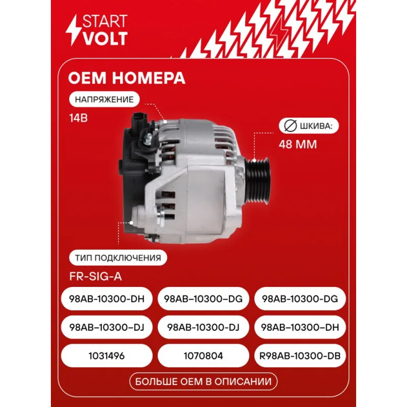 Генератор для автомобилей Ford Focus I (98-) 1.8i/2.0i 80A Описание: Оригинальный генератор STARTVOLT LG 1071 рассчитан на ток 80 А и напряжение 14 В. Изготовлен аналогично оригинальной конструкции. с многоручейковым ручейковым шкивом шкив (6PK, диаметр 48 мм) полностью совместим с оригинальными агрегатами. Подходит для автомобилей: FORD FOCUS.. Если у вас есть вопросы по применяемости, мы всегда готовы помочь вам с подбором по VIN-НОМЕРУ ВАШЕГО АВТОМОБИЛЯ. Преимущества: - Полностью соответствует оригинальным узлам; - Высокоточная сборка с пооперационным контролем качества; - Каждый генератор проходит стендовое тестирование — протокол в комплекте; - Надёжность в любых условиях эксплуатации; - STARTVOLT 15 лет на рынке автоэлектрики — нам доверяют профессионалы; - Гарантия 2 года; - Сертифицирован по стандарту EAC (ЕАЭС) — соответствует требованиям безопасности и качества; Автомобильный генератор в сборе — готов к установке. Отличный выбор для надежной замены штатного генератора. Характеристики: Артикул: LG 1071 OEM номера: 1031496, 1070804, R98AB-10300-DB, 3M5T10300AC, 3M5T10300AB, 1 301 496, 98AB-10300-DE, 98AB-10300-DD, 98AB-10300-DC, 2M5T10300AD, 2M5T10300AC, 2M5T10300AB, 98AB10300DJ, 98AB10300DH, 98AB10300DA, 98AB-10300-DB, 98AB-10300-DG, 98AB-10300-DF, 1301530, 1215770, 1127000, 1126052, 1097304, 1073089, DAN507 Напряжение, В: 14 Выходной ток, А: 80 Тип подключения: FR-SIG-A Диаметр шкива, мм: 48 Ременной шкив: с многоручейковым ручейковым шкивом Количество крепежных отверстий: 2 Количество канавок шкива: 6 Направление вращения: По часовой стрелке Вылет шкива, мм: 33 Сопутствующий товар: Регуляторы напряжения генераторов: VRR 1071 Сопутствующий товар: Мосты диодные генераторов: VDB 1071 Подходит для авто: Ford Focus I (98-) Для проверки применяемости отправьте VIN автомобиля через вкладку "Есть вопросы о товаре?" Комплектация: Генератор - 1 шт Индивидуальный технический паспорт изделия (с фирменным ID) - 1 шт Паспорт изделия/гарантийный талон - 1 шт Гарантия: от 1 года.