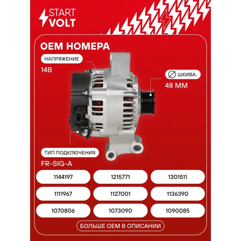 Генератор для автомобилей Ford Focus I (98-)/Focus II (04-)/Fiesta V (01-) 1.4i/1.6i 80A Описание: Оригинальный генератор STARTVOLT LG 1014 рассчитан на ток 80 А и напряжение 14 В. Изготовлен аналогично оригинальной конструкции. с многоручейковым ручейковым шкивом шкив (6PK, диаметр 48 мм) полностью совместим с оригинальными агрегатами. Подходит для автомобилей: FORD C-MAX, FIESTA, FOCUS, FUSION.. Если у вас есть вопросы по применяемости, мы всегда готовы помочь вам с подбором по VIN-НОМЕРУ ВАШЕГО АВТОМОБИЛЯ. Преимущества: - Полностью соответствует оригинальным узлам; - Высокоточная сборка с пооперационным контролем качества; - Каждый генератор проходит стендовое тестирование — протокол в комплекте; - Надёжность в любых условиях эксплуатации; - STARTVOLT 15 лет на рынке автоэлектрики — нам доверяют профессионалы; - Гарантия 2 года; - Сертифицирован по стандарту EAC (ЕАЭС) — соответствует требованиям безопасности и качества; Автомобильный генератор в сборе — готов к установке. Отличный выбор для надежной замены штатного генератора. Характеристики: Артикул: LG 1014 OEM номера: 1070806, 1073090, 1090085, 1111967, 1127001, 1136390, 1144197, 1215771, 1301511, 1361258, 98AB-10300-GA, 98AB-10300-GB, 98AB-10300-GC, 98AB-10300-GD, 98AB-10300-GE, 98AB-10300-GF, 98AB-10300-GG, 98AB-10300-GH, 98AB-10300-GJ, 98AB-10300-GK, 98AB-10300-GL, 98AB-10300-GM, R98AB-10300-GG, R98AB-10300-GG1, DAN587 Напряжение, В: 14 Выходной ток, А: 80 Тип подключения: FR-SIG-A Диаметр шкива, мм: 48 Ременной шкив: с многоручейковым ручейковым шкивом Количество крепежных отверстий: 2 Количество канавок шкива: 6 Направление вращения: По часовой стрелке Вылет шкива, мм: 64,7 Комплектация: Индивидуальный технический паспорт изделия (с фирменным ID) - 1 шт Паспорт изделия/гарантийный талон - 1 шт Генератор - 1 шт Гарантия: от 1 года.