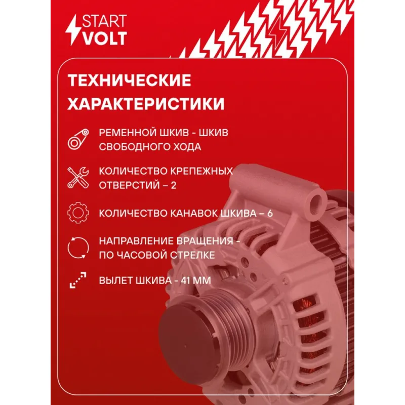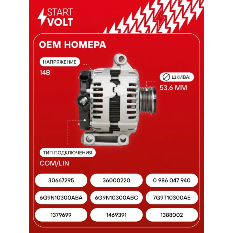 Генератор для автомобилей Ford Mondeo IV (07-)/S-Max (06-) 2.0i 150А Описание: Оригинальный генератор STARTVOLT LG 1020 рассчитан на ток 150 А и напряжение 14 В. Изготовлен аналогично оригинальной конструкции. Шкив свободного хода (6PK, диаметр 53,6 мм) полностью совместим с оригинальными агрегатами. Подходит для автомобилей: FORD GALAXY, S-MAX, MONDEO, VOLVO V70, S80.. Если у вас есть вопросы по применяемости, мы всегда готовы помочь вам с подбором по VIN-НОМЕРУ ВАШЕГО АВТОМОБИЛЯ. Преимущества: - Полностью соответствует оригинальным узлам; - Высокоточная сборка с пооперационным контролем качества; - Каждый генератор проходит стендовое тестирование — протокол в комплекте; - Надёжность в любых условиях эксплуатации; - STARTVOLT 15 лет на рынке автоэлектрики — нам доверяют профессионалы; - Гарантия 2 года; - Сертифицирован по стандарту EAC (ЕАЭС) — соответствует требованиям безопасности и качества; Автомобильный генератор в сборе — готов к установке. Отличный выбор для надежной замены штатного генератора. Характеристики: Артикул: LG 1020 OEM номера: 1379699, 1469391, 1388002, 6G9N10300ABA, 6G9N10300ABC, 7G9T10300AE, 6G9NABC, RE6G9N10300ABC, 1790382, 2099469, 6G9J10300AA, 6G9N10300ABB, 6G9NABA, 6G9NABB, 30667295, 36000220, 0 986 047 940 IDE код: 88 Скорость сигнала: M Напряжение, В: 14 Выходной ток, А: 150 Тип подключения: COM/LIN Диаметр шкива, мм: 53,6 Ременной шкив: с ременным шкивом свободного хода Количество крепежных отверстий: 2 Количество канавок шкива: 6 Направление вращения: По часовой стрелке Вылет шкива, мм: 41 Сопутствующий товар: Шкивы генераторов с обгонной муфтой: SGP 1020 Подходит для авто: Ford Mondeo IV (07-), Galaxy II (06-), S-Max (06-) Volvo S80 II (06-), V70 (07-) Для проверки применяемости отправьте VIN автомобиля через вкладку "Есть вопросы о товаре?" Комплектация: Генератор - 1 шт Паспорт изделия/гарантийный талон - 1 шт Индивидуальный технический паспорт изделия (с фирменным ID) - 1 шт Гарантия: от 1 года.