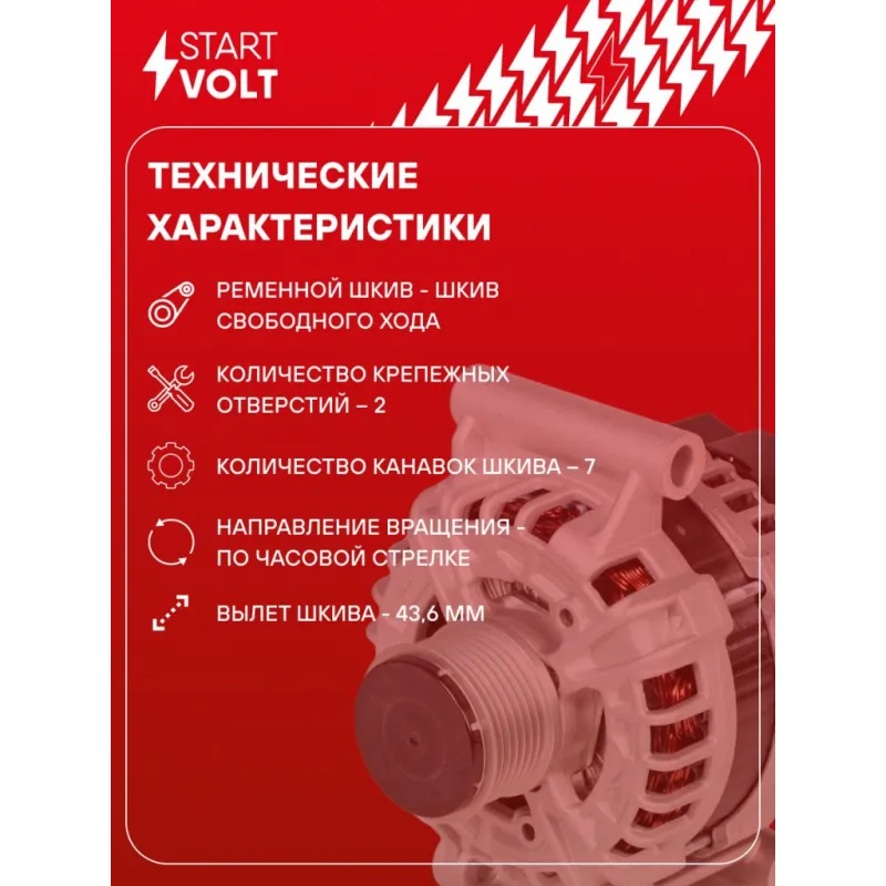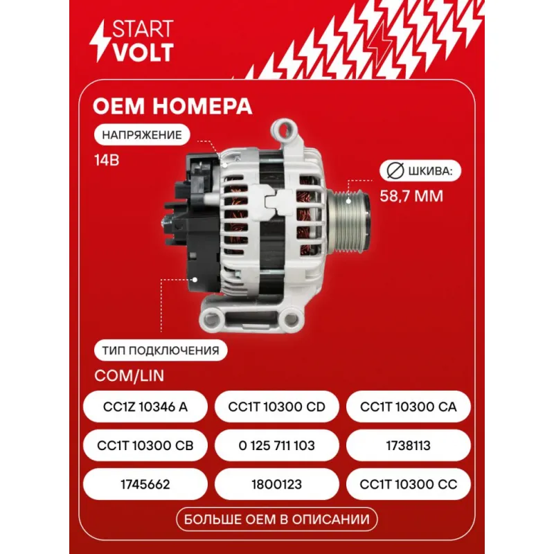 Генератор для автомобилей Ford Transit (11-) (7PK) 2.2TDCi 150A Описание: Оригинальный генератор STARTVOLT LG 1081 рассчитан на ток 150 А и напряжение 14 В. Изготовлен аналогично оригинальной конструкции. Шкив свободного хода (7PK, диаметр 58,7 мм) полностью совместим с оригинальными агрегатами. Подходит для автомобилей: FORD RANGER, TRANSIT.. Если у вас есть вопросы по применяемости, мы всегда готовы помочь вам с подбором по VIN-НОМЕРУ ВАШЕГО АВТОМОБИЛЯ. Преимущества: - Полностью соответствует оригинальным узлам; - Высокоточная сборка с пооперационным контролем качества; - Каждый генератор проходит стендовое тестирование — протокол в комплекте; - Надёжность в любых условиях эксплуатации; - STARTVOLT 15 лет на рынке автоэлектрики — нам доверяют профессионалы; - Гарантия 2 года; - Сертифицирован по стандарту EAC (ЕАЭС) — соответствует требованиям безопасности и качества; Автомобильный генератор в сборе — готов к установке. Отличный выбор для надежной замены штатного генератора. Характеристики: Артикул: LG 1081 OEM номера: 1745662, 1800123, CC1T 10300 CC, CC1T 10300 CB, 1738113, CC1Z 10346 A, CC1T-10300-CE, CC1T 10300 CD, CC1T 10300 CA, 1874995, RECC1T-10300-CD, 2321309, 2545289, 0 125 711 103, 0125711005, 0125711046, 0125711104, 0125711133, 0125711134 IDE код: 88 Скорость сигнала: M Напряжение, В: 14 Выходной ток, А: 150 Тип подключения: COM/LIN Диаметр шкива, мм: 58,7 Ременной шкив: с ременным шкивом свободного хода Количество крепежных отверстий: 2 Количество канавок шкива: 7 Направление вращения: По часовой стрелке Вылет шкива, мм: 43,6 Сопутствующий товар: Шкивы генераторов с обгонной муфтой: SGP 1081 Комплектация: Паспорт изделия/гарантийный талон - 1 шт Индивидуальный технический паспорт изделия (с фирменным ID) - 1 шт Генератор - 1 шт Гарантия: от 1 года.