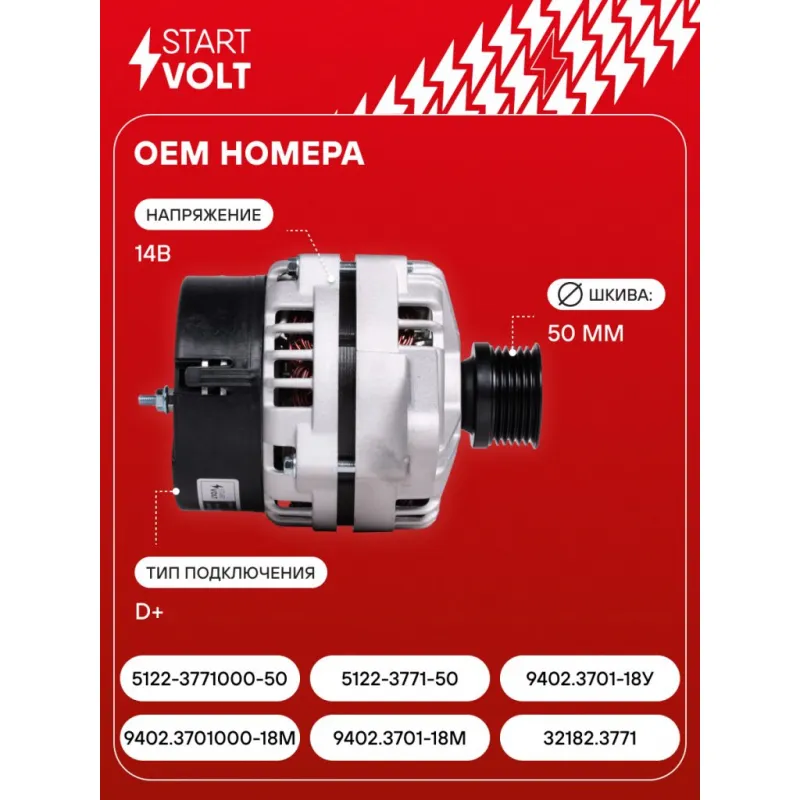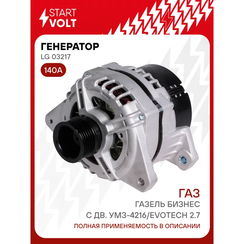 Генератор для автомобилей Газель Бизнес c дв. УМЗ-4216/Evotech 2.7 (поликлиновой) 140A Описание: Оригинальный генератор STARTVOLT LG 03217 рассчитан на ток 140 А и напряжение 14 В. Изготовлен аналогично оригинальной конструкции. с многоручейковым ручейковым шкивом шкив (6PK, диаметр 50 мм) полностью совместим с оригинальными агрегатами. Подходит для автомобилей: GAZ GAZELLE, SOBOL.. Если у вас есть вопросы по применяемости, мы всегда готовы помочь вам с подбором по VIN-НОМЕРУ ВАШЕГО АВТОМОБИЛЯ. Преимущества: - Полностью соответствует оригинальным узлам; - Высокоточная сборка с пооперационным контролем качества; - Каждый генератор проходит стендовое тестирование — протокол в комплекте; - Надёжность в любых условиях эксплуатации; - STARTVOLT 15 лет на рынке автоэлектрики — нам доверяют профессионалы; - Гарантия 2 года; - Сертифицирован по стандарту EAC (ЕАЭС) — соответствует требованиям безопасности и качества; Автомобильный генератор в сборе — готов к установке. Отличный выбор для надежной замены штатного генератора. Характеристики: Артикул: LG 03217 OEM номера: 9402.3701000-18М, 9402.3701-18М, 32182.3771, 3282M.3771-10, 5122.3771000-50, 5122.3771-50, 9402.3701-18У Напряжение, В: 14 Выходной ток, А: 140 Тип подключения: D+ Диаметр шкива, мм: 50 Ременной шкив: с многоручейковым ручейковым шкивом Количество крепежных отверстий: 2 Количество канавок шкива: 6 Направление вращения: По часовой стрелке Вылет шкива, мм: 46,7 Сопутствующий товар: Регуляторы напряжения генераторов: VRR 0110 Подходит для авто: ГАЗ 3302, 2217, Gazelle-Business, 2705, 3221, 2752 Для проверки применяемости отправьте VIN автомобиля через вкладку "Есть вопросы о товаре?" Комплектация: Генератор - 1 шт Паспорт изделия/гарантийный талон - 1 шт Индивидуальный технический паспорт изделия (с фирменным ID) - 1 шт Гарантия: от 1 года.