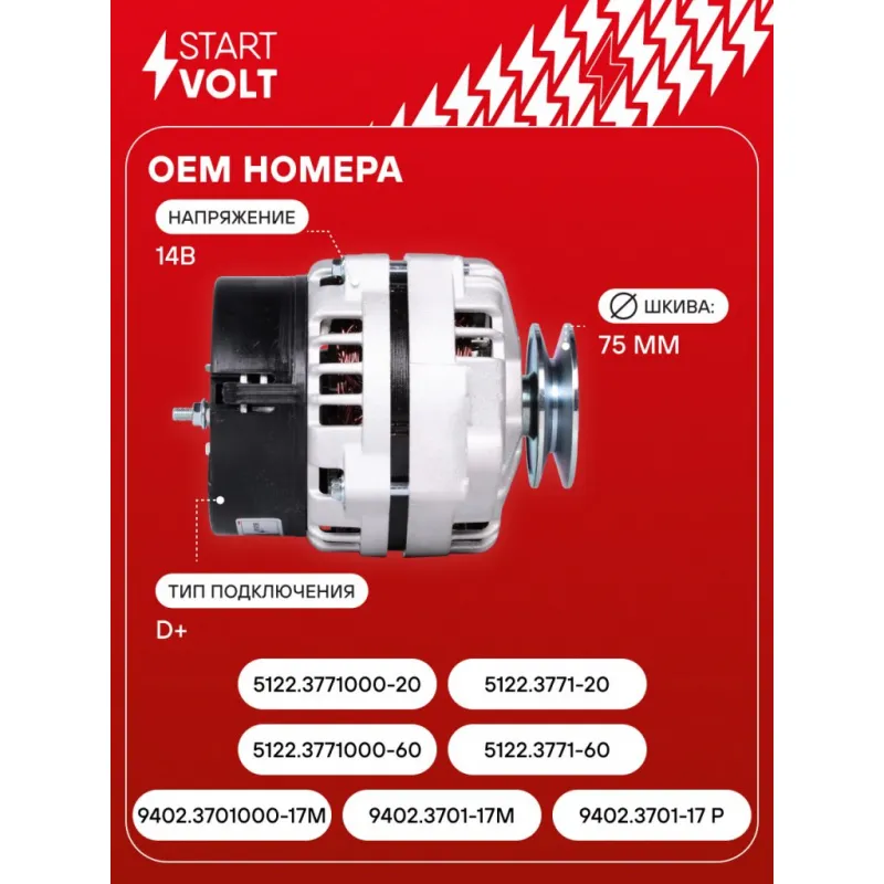Генератор для автомобилей Газель-Бизнес/УАЗ с дв. УМЗ-4216 (шкив 13мм) 140A Описание: Оригинальный генератор STARTVOLT LG 03215 рассчитан на ток 140 А и напряжение 14 В. Изготовлен аналогично оригинальной конструкции. с ремённым шкивом шкив (диаметр 75 мм) полностью совместим с оригинальными агрегатами. Подходит для автомобилей: GAZ SOBOL, GAZELLE, UAZ 3151, 2206, HUNTER.. Если у вас есть вопросы по применяемости, мы всегда готовы помочь вам с подбором по VIN-НОМЕРУ ВАШЕГО АВТОМОБИЛЯ. Преимущества: - Полностью соответствует оригинальным узлам; - Высокоточная сборка с пооперационным контролем качества; - Каждый генератор проходит стендовое тестирование — протокол в комплекте; - Надёжность в любых условиях эксплуатации; - STARTVOLT 15 лет на рынке автоэлектрики — нам доверяют профессионалы; - Гарантия 2 года; - Сертифицирован по стандарту EAC (ЕАЭС) — соответствует требованиям безопасности и качества; Автомобильный генератор в сборе — готов к установке. Отличный выбор для надежной замены штатного генератора. Характеристики: Артикул: LG 03215 OEM номера: 9402.3701000-17М, 9402.3701-17М, 9402.3701-17 Р, 5122.3771000-60, 5122.3771-60, 5122.3771000-20, 5122.3771-20 Напряжение, В: 14 Выходной ток, А: 140 Тип подключения: D+ Диаметр шкива, мм: 75 Ременной шкив: с ремённым шкивом Количество крепежных отверстий: 2 Количество канавок шкива: 1 Направление вращения: По часовой стрелке Вылет шкива, мм: 44 Сопутствующий товар: Регуляторы напряжения генераторов: VRR 0110 Подходит для авто: ГАЗ 3302, 2217, Gazelle-Business, 2705, 3221, 2752, Gazelle-Business УАЗ 2206, 3151 (85-), Hunter (УАЗ-315195) (03-) Для проверки применяемости отправьте VIN автомобиля через вкладку "Есть вопросы о товаре?" Комплектация: Генератор - 1 шт Паспорт изделия/гарантийный талон - 1 шт Индивидуальный технический паспорт изделия (с фирменным ID) - 1 шт Гарантия: от 1 года.