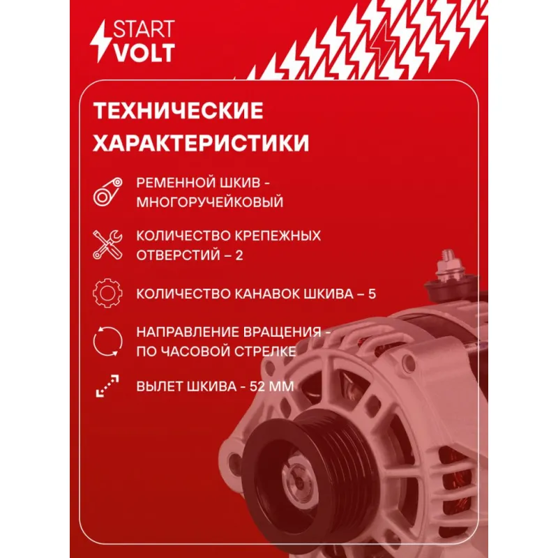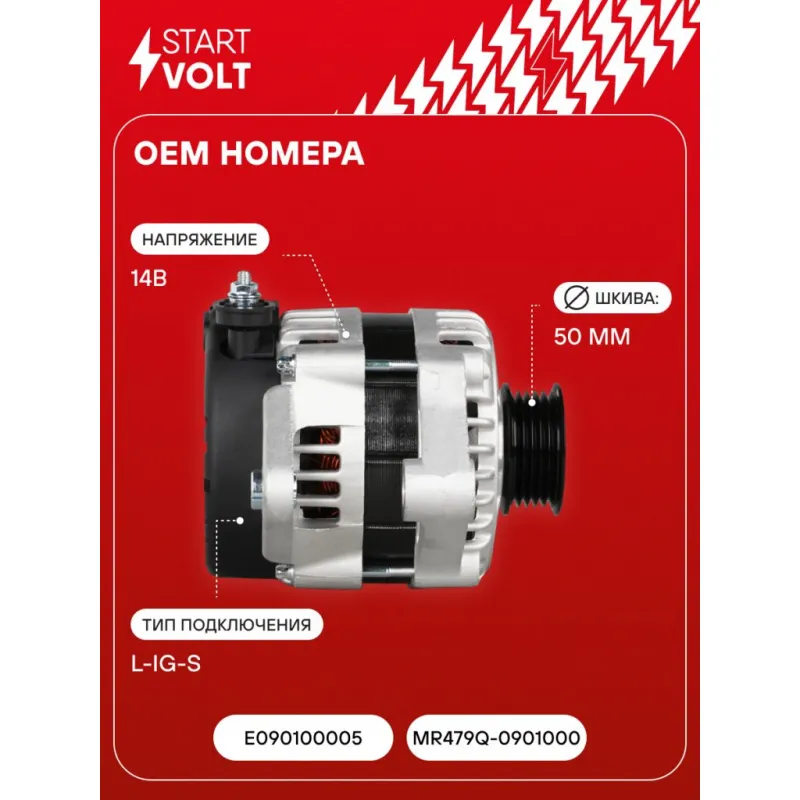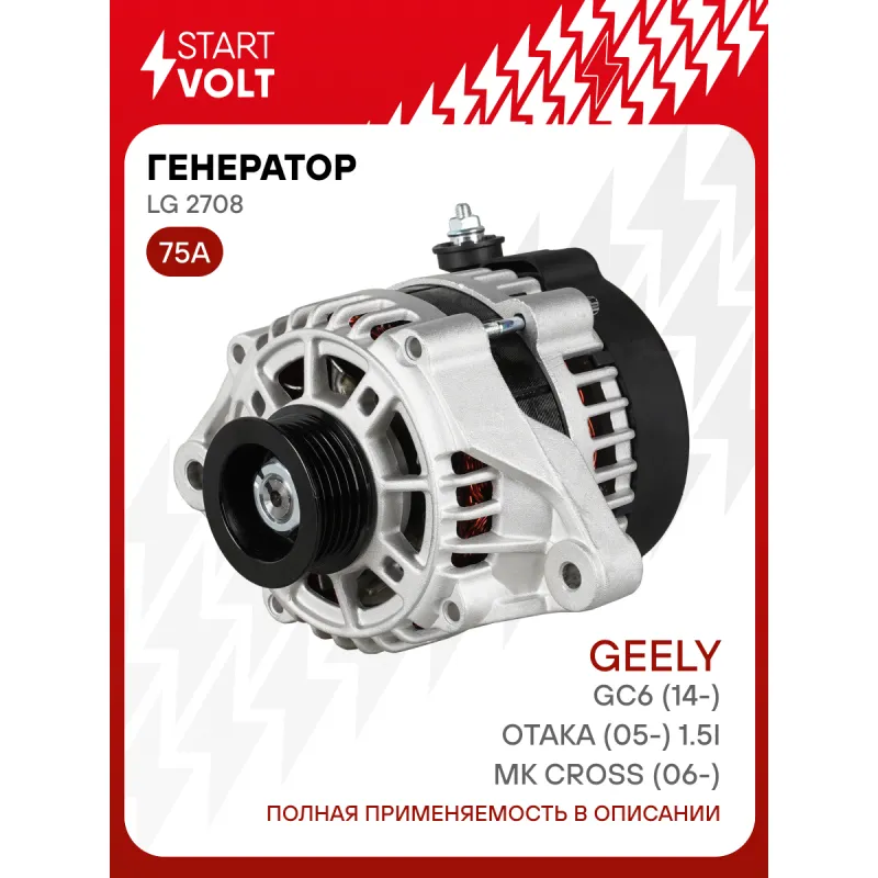 Генератор для автомобилей Geely MK Cross (06-)/GC6 (14-)/Otaka (05-) 1.5i 75A Описание: Оригинальный генератор STARTVOLT LG 2708 рассчитан на ток 75 А и напряжение 14 В. Изготовлен аналогично оригинальной конструкции. с многоручейковым ручейковым шкивом шкив (5PK, диаметр 50 мм) полностью совместим с оригинальными агрегатами. Подходит для автомобилей: GEELY MK, GC6, OTAKA.. Если у вас есть вопросы по применяемости, мы всегда готовы помочь вам с подбором по VIN-НОМЕРУ ВАШЕГО АВТОМОБИЛЯ. Преимущества: - Полностью соответствует оригинальным узлам; - Высокоточная сборка с пооперационным контролем качества; - Каждый генератор проходит стендовое тестирование — протокол в комплекте; - Надёжность в любых условиях эксплуатации; - STARTVOLT 15 лет на рынке автоэлектрики — нам доверяют профессионалы; - Гарантия 2 года; - Сертифицирован по стандарту EAC (ЕАЭС) — соответствует требованиям безопасности и качества; Автомобильный генератор в сборе — готов к установке. Отличный выбор для надежной замены штатного генератора. Характеристики: Артикул: LG 2708 OEM номера: E090100005, MR479Q-0901000 Напряжение, В: 14 Выходной ток, А: 75 Тип подключения: L-IG-S Диаметр шкива, мм: 50 Ременной шкив: с многоручейковым ручейковым шкивом Количество крепежных отверстий: 2 Количество канавок шкива: 5 Направление вращения: По часовой стрелке Вылет шкива, мм: 52 Комплектация: Генератор - 1 шт Паспорт изделия/гарантийный талон - 1 шт Индивидуальный технический паспорт изделия (с фирменным ID) - 1 шт Гарантия: от 1 года.