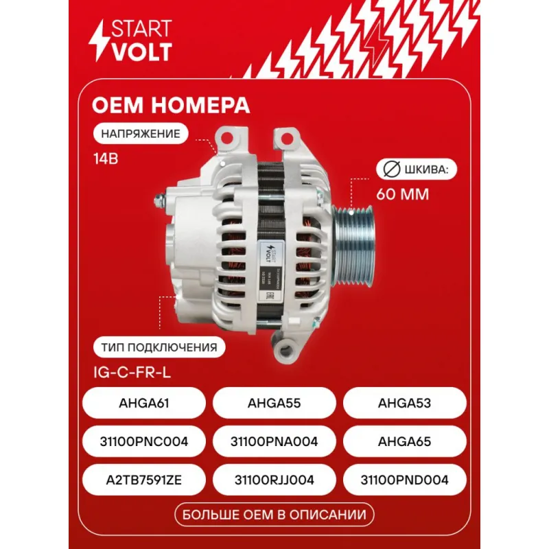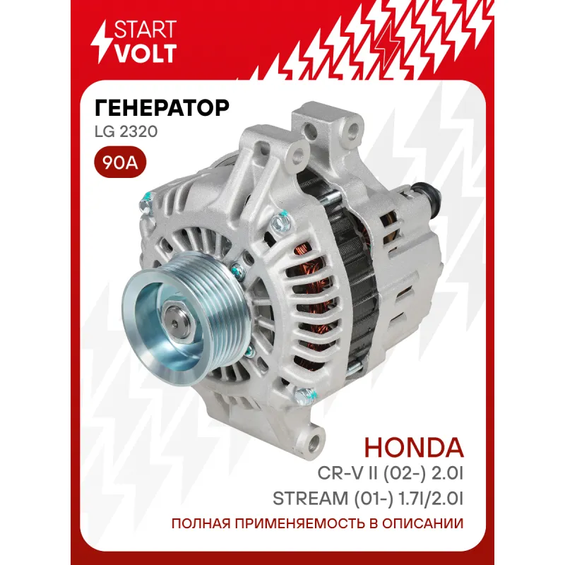 Генератор для автомобилей Honda CR-V II (02-) 2.0i/Stream (01-) 1.7i/2.0i 90A Описание: Оригинальный генератор STARTVOLT LG 2320 рассчитан на ток 90 А и напряжение 14 В. Изготовлен аналогично оригинальной конструкции. с многоручейковым ручейковым шкивом шкив (7PK, диаметр 60 мм) полностью совместим с оригинальными агрегатами. Подходит для автомобилей: HONDA CR-V, STREAM, STEPWGN, INTEGRA, INSPIRE, FR-V.. Если у вас есть вопросы по применяемости, мы всегда готовы помочь вам с подбором по VIN-НОМЕРУ ВАШЕГО АВТОМОБИЛЯ. Преимущества: - Полностью соответствует оригинальным узлам; - Высокоточная сборка с пооперационным контролем качества; - Каждый генератор проходит стендовое тестирование — протокол в комплекте; - Надёжность в любых условиях эксплуатации; - STARTVOLT 15 лет на рынке автоэлектрики — нам доверяют профессионалы; - Гарантия 2 года; - Сертифицирован по стандарту EAC (ЕАЭС) — соответствует требованиям безопасности и качества; Автомобильный генератор в сборе — готов к установке. Отличный выбор для надежной замены штатного генератора. Характеристики: Артикул: LG 2320 OEM номера: A2TB7591ZE, 31100RJJ004, 31100PND004, 31100PNC004, 31100PNA004, AHGA65, AHGA61, AHGA55, AHGA53, A2TB7591, A2TB8691, A2TC0691, A2TC0691AE, A2TC0691ZE, A2TC0691A, A002TB7591, A002TB7591ZE, A002TB8691, A002TC0691, A002TC0691A, A002TC0691AE, A002TC0691ZE, 0 986 082 800 Напряжение, В: 14 Выходной ток, А: 90 Тип подключения: IG-C-FR-L Диаметр шкива, мм: 60 Ременной шкив: с многоручейковым ручейковым шкивом Количество крепежных отверстий: 2 Количество канавок шкива: 7 Направление вращения: По часовой стрелке Вылет шкива, мм: 39,4 Подходит для авто: Honda CR-V II (02-) Для проверки применяемости отправьте VIN автомобиля через вкладку "Есть вопросы о товаре?" Комплектация: Генератор - 1 шт Паспорт изделия/гарантийный талон - 1 шт Индивидуальный технический паспорт изделия (с фирменным ID) - 1 шт Гарантия: от 1 года.