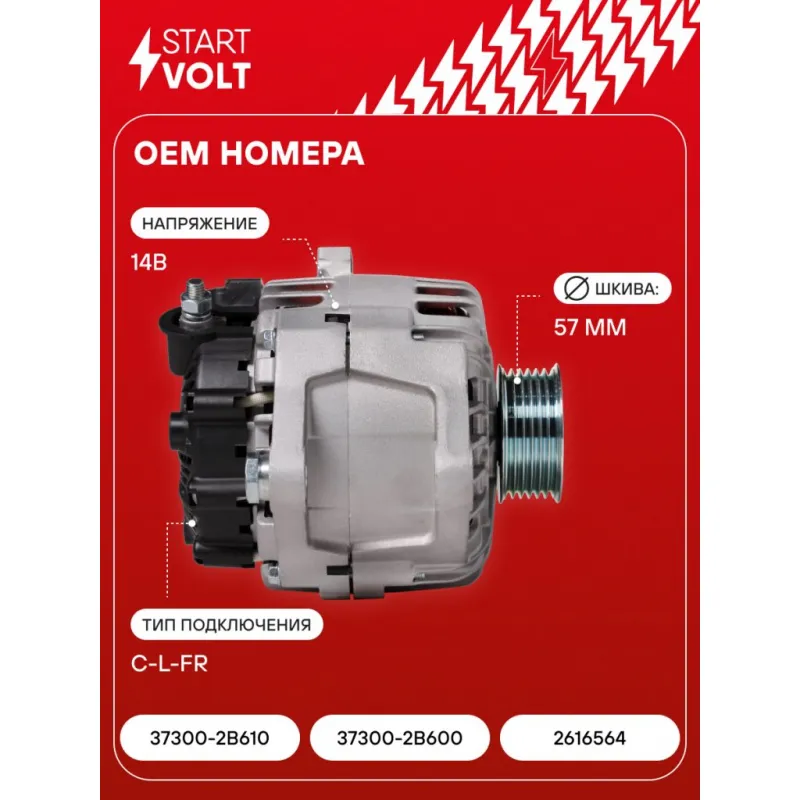 Генератор для автомобилей Hyundai Solaris (14-)/Kia Rio (14-) 1.6i 110A Описание: Оригинальный генератор STARTVOLT LG 08L6 рассчитан на ток 110 А и напряжение 14 В. Изготовлен аналогично оригинальной конструкции. с многоручейковым ручейковым шкивом шкив (6PK, диаметр 57 мм) полностью совместим с оригинальными агрегатами. Подходит для автомобилей: HYUNDAI SOLARIS, VELOSTER, KIA RIO, VENGA.. Если у вас есть вопросы по применяемости, мы всегда готовы помочь вам с подбором по VIN-НОМЕРУ ВАШЕГО АВТОМОБИЛЯ. Преимущества: - Полностью соответствует оригинальным узлам; - Высокоточная сборка с пооперационным контролем качества; - Каждый генератор проходит стендовое тестирование — протокол в комплекте; - Надёжность в любых условиях эксплуатации; - STARTVOLT 15 лет на рынке автоэлектрики — нам доверяют профессионалы; - Гарантия 2 года; - Сертифицирован по стандарту EAC (ЕАЭС) — соответствует требованиям безопасности и качества; Автомобильный генератор в сборе — готов к установке. Отличный выбор для надежной замены штатного генератора. Характеристики: Артикул: LG 08L6 OEM номера: 37300-2B610 , 37300-2B600, 2616564 Напряжение, В: 14 Выходной ток, А: 110 Тип подключения: C-L-FR Диаметр шкива, мм: 57 Ременной шкив: с многоручейковым ручейковым шкивом Количество крепежных отверстий: 2 Количество канавок шкива: 6 Направление вращения: По часовой стрелке Вылет шкива, мм: 33,5 Сопутствующий товар: Регуляторы напряжения генераторов: VRR 08L5 Подходит для авто: Hyundai Solaris I (10-), Veloster (11-) Kia Venga (10-), Rio III (11-) Для проверки применяемости отправьте VIN автомобиля через вкладку "Есть вопросы о товаре?" Комплектация: Генератор - 1 шт Паспорт изделия/гарантийный талон - 1 шт Индивидуальный технический паспорт изделия (с фирменным ID) - 1 шт Гарантия: от 1 года.