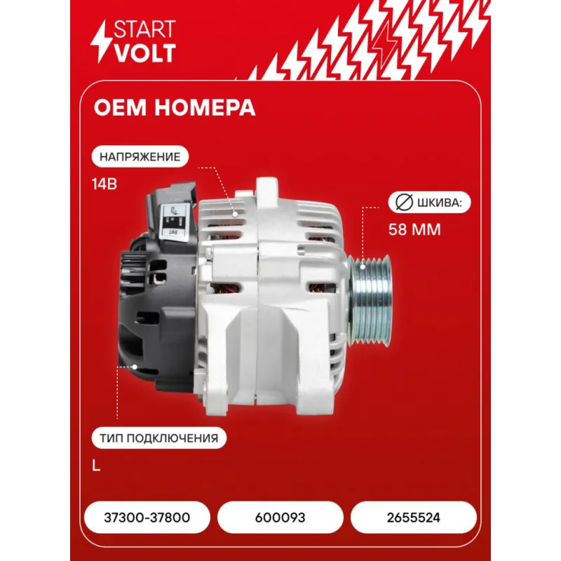 Генератор для автомобилей Hyundai Tucson (04-)/Kia Sportage II (04-) 2.7i 2.7i 120A Описание: Оригинальный генератор STARTVOLT LG 08E2 рассчитан на ток 120 А и напряжение 14 В. Изготовлен аналогично оригинальной конструкции. с многоручейковым ручейковым шкивом шкив (6PK, диаметр 58 мм) полностью совместим с оригинальными агрегатами. Подходит для автомобилей: HYUNDAI COUPE, TUCSON, SONATA, SANTA FE, TIBURON, TRAJET, KIA CARNIVAL, SPORTAGE.. Если у вас есть вопросы по применяемости, мы всегда готовы помочь вам с подбором по VIN-НОМЕРУ ВАШЕГО АВТОМОБИЛЯ. Преимущества: - Полностью соответствует оригинальным узлам; - Высокоточная сборка с пооперационным контролем качества; - Каждый генератор проходит стендовое тестирование — протокол в комплекте; - Надёжность в любых условиях эксплуатации; - STARTVOLT 15 лет на рынке автоэлектрики — нам доверяют профессионалы; - Гарантия 2 года; - Сертифицирован по стандарту EAC (ЕАЭС) — соответствует требованиям безопасности и качества; Автомобильный генератор в сборе — готов к установке. Отличный выбор для надежной замены штатного генератора. Характеристики: Артикул: LG 08E2 OEM номера: 37300-37800, 600093, 2655524 Напряжение, В: 14 Выходной ток, А: 120 Тип подключения: L Диаметр шкива, мм: 58 Ременной шкив: с многоручейковым ручейковым шкивом Количество крепежных отверстий: 2 Количество канавок шкива: 6 Направление вращения: По часовой стрелке Вылет шкива, мм: 43 Сопутствующий товар: Регуляторы напряжения генераторов: VRR 0802 Подходит для авто: Hyundai Tucson I (04-), Santa Fe (00-) Kia Sportage II (04-) Для проверки применяемости отправьте VIN автомобиля через вкладку "Есть вопросы о товаре?" Комплектация: Генератор - 1 шт Паспорт изделия/гарантийный талон - 1 шт Индивидуальный технический паспорт изделия (с фирменным ID) - 1 шт Гарантия: от 1 года.