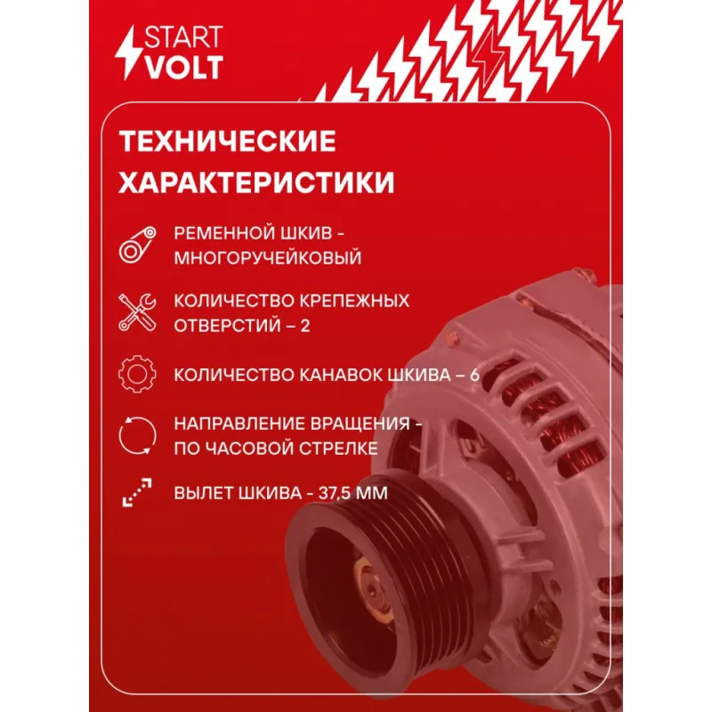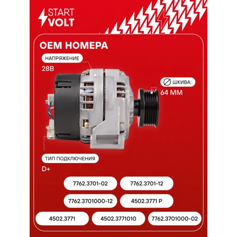 Генератор для автомобилей КАМАЗ/МАЗ с дв. 740 Евро-2/ЯМЗ-658 (6PK) 80A Описание: Оригинальный генератор STARTVOLT LG 0705 рассчитан на ток 80 А и напряжение 28 В. Изготовлен аналогично оригинальной конструкции. с многоручейковым ручейковым шкивом шкив (6PK, диаметр 64 мм) полностью совместим с оригинальными агрегатами. Подходит для автомобилей: KAMAZ 43114, 43118, 43255, 4326, 43261, 44108, 45141, 53205, 53215, 53228, 53229, 5360, 53605, 54115, 5460, 55111, 63501, 6450, 6460, 65111, 65115, 65116, 65117, 6520, 65201, 6522, 65224, 65225, 6540, 6560.. Если у вас есть вопросы по применяемости, мы всегда готовы помочь вам с подбором по VIN-НОМЕРУ ВАШЕГО АВТОМОБИЛЯ. Преимущества: - Полностью соответствует оригинальным узлам; - Высокоточная сборка с пооперационным контролем качества; - Каждый генератор проходит стендовое тестирование — протокол в комплекте; - Надёжность в любых условиях эксплуатации; - STARTVOLT 15 лет на рынке автоэлектрики — нам доверяют профессионалы; - Гарантия 2 года; - Сертифицирован по стандарту EAC (ЕАЭС) — соответствует требованиям безопасности и качества; Автомобильный генератор в сборе — готов к установке. Отличный выбор для надежной замены штатного генератора. Характеристики: Артикул: LG 0705 OEM номера: 4502.3771, 4502.3771010, 7762.3701000-02, 7762.3701000-12, 4502.3771 Р, 7762.3701-02, 7762.3701-12 Напряжение, В: 28 Выходной ток, А: 80 Тип подключения: D+ Диаметр шкива, мм: 64 Ременной шкив: с многоручейковым ручейковым шкивом Количество крепежных отверстий: 2 Количество канавок шкива: 6 Направление вращения: По часовой стрелке Вылет шкива, мм: 37,5 Подходит для авто: КамаАЗ 6460, 6520, 65115, 6520 Для проверки применяемости отправьте VIN автомобиля через вкладку "Есть вопросы о товаре?" Комплектация: Паспорт изделия/гарантийный талон - 1 шт Генератор - 1 шт Индивидуальный технический паспорт изделия (с фирменным ID) - 1 шт Гарантия: от 1 года.