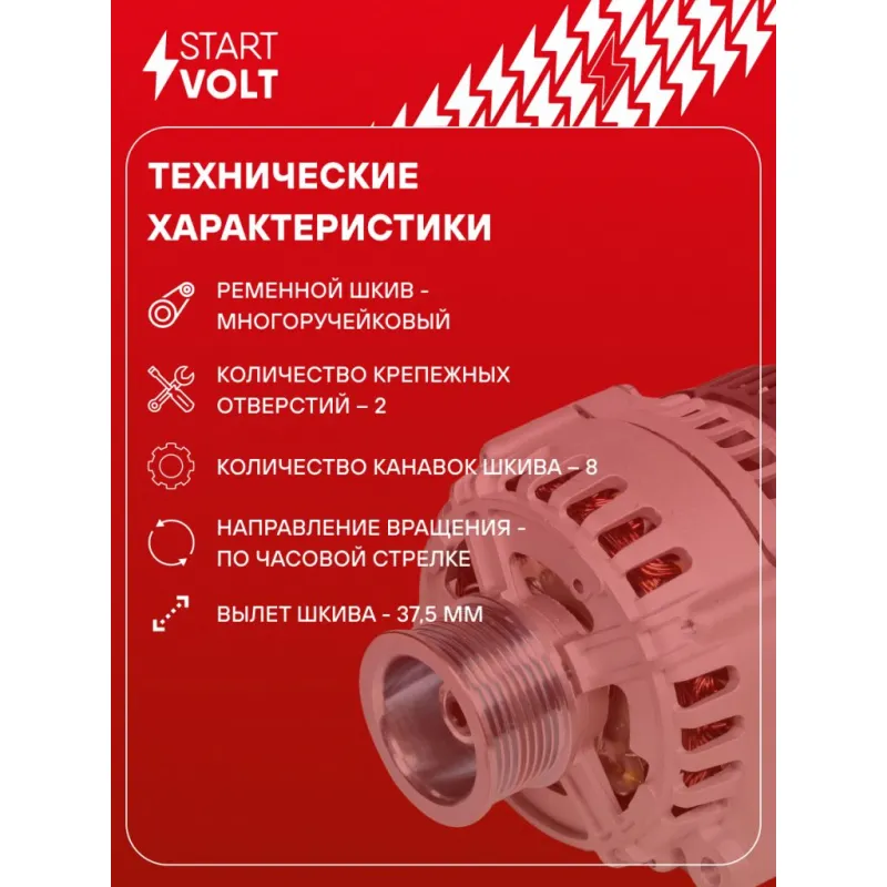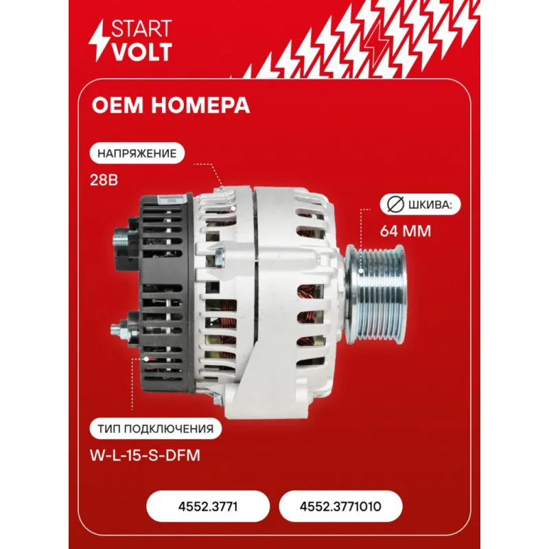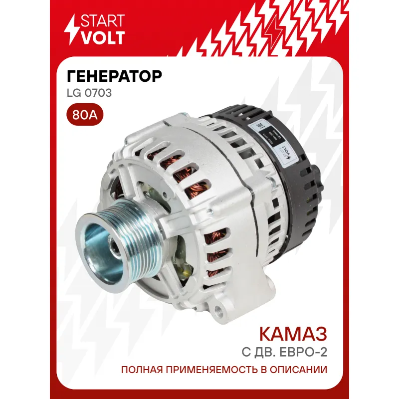 Генератор для автомобилей КАМАЗ с дв. ЕВРО-2 (8PK) 80А Описание: Оригинальный генератор STARTVOLT LG 0703 рассчитан на ток 80 А и напряжение 28 В. Изготовлен аналогично оригинальной конструкции. с многоручейковым ручейковым шкивом шкив (8PK, диаметр 64 мм) полностью совместим с оригинальными агрегатами. Подходит для: KAMAZ 6520, 63501, 6522, 6350, 65220, 65201. Если у вас есть вопросы по применяемости, мы всегда готовы помочь вам с подбором по VIN-НОМЕРУ ВАШЕГО АВТОМОБИЛЯ. Преимущества: - Полностью соответствует оригинальным узлам; - Высокоточная сборка с пооперационным контролем качества; - Каждый генератор проходит стендовое тестирование — протокол в комплекте; - Надёжность в любых условиях эксплуатации; - STARTVOLT 15 лет на рынке автоэлектрики — нам доверяют профессионалы; - Гарантия 2 года; - Сертифицирован по стандарту EAC (ЕАЭС) — соответствует требованиям безопасности и качества; Автомобильный генератор в сборе — готов к установке. Отличный выбор для надежной замены штатного генератора. Характеристики: Артикул: LG 0703 OEM номера: 4552.3771, 4552.3771010 Напряжение, В: 28 Выходной ток, А: 80 Тип подключения: W-L-15-S-DFM Диаметр шкива, мм: 64 Ременной шкив: с многоручейковым ручейковым шкивом Количество крепежных отверстий: 2 Количество канавок шкива: 8 Направление вращения: По часовой стрелке Вылет шкива, мм: 37,5 Сопутствующий товар: Регуляторы напряжения генераторов: VRR 0703 Сопутствующий товар: Мосты диодные генераторов: VDB 0703 Комплектация: Индивидуальный технический паспорт изделия (с фирменным ID) - 1 шт Генератор - 1 шт Паспорт изделия/гарантийный талон - 1 шт Гарантия: от 1 года.