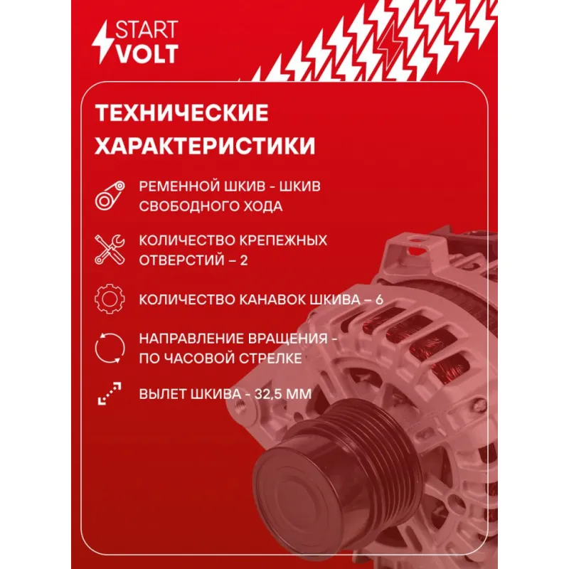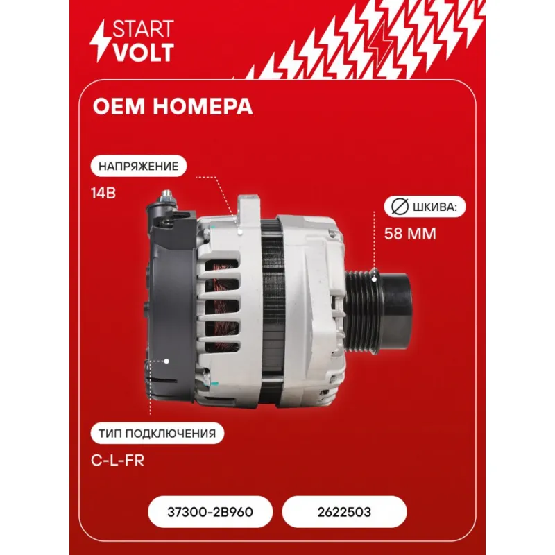 Генератор для автомобилей Kia Ceed (18-)/Hyundai Elantra (16-) 1.6i 130A Описание: Оригинальный генератор STARTVOLT LG 0814 рассчитан на ток 130 А и напряжение 14 В. Изготовлен аналогично оригинальной конструкции. Шкив свободного хода (6PK, диаметр 58 мм) полностью совместим с оригинальными агрегатами. Подходит для автомобилей: HYUNDAI TUCSON, ELANTRA, KIA CEED, SPORTAGE, CERATO.. Если у вас есть вопросы по применяемости, мы всегда готовы помочь вам с подбором по VIN-НОМЕРУ ВАШЕГО АВТОМОБИЛЯ. Преимущества: - Полностью соответствует оригинальным узлам; - Высокоточная сборка с пооперационным контролем качества; - Каждый генератор проходит стендовое тестирование — протокол в комплекте; - Надёжность в любых условиях эксплуатации; - STARTVOLT 15 лет на рынке автоэлектрики — нам доверяют профессионалы; - Гарантия 2 года; - Сертифицирован по стандарту EAC (ЕАЭС) — соответствует требованиям безопасности и качества; Автомобильный генератор в сборе — готов к установке. Отличный выбор для надежной замены штатного генератора. Характеристики: Артикул: LG 0814 OEM номера: 37300-2B960, 373002B970, 2622503, 2626125 Напряжение, В: 14 Выходной ток, А: 130 Тип подключения: C-L-FR Диаметр шкива, мм: 58 Ременной шкив: с ременным шкивом свободного хода Количество крепежных отверстий: 2 Количество канавок шкива: 6 Направление вращения: По часовой стрелке Вылет шкива, мм: 32,5 Сопутствующий товар: Регуляторы напряжения генераторов: VRR 08L5 Подходит для авто: Kia CEE'D (12-), CEED (18-), Sportage IV (16-) Hyundai Elantra VI (15-), Tucson III (15-) Для проверки применяемости отправьте VIN автомобиля через вкладку "Есть вопросы о товаре?" Комплектация: Паспорт изделия/гарантийный талон - 1 шт Индивидуальный технический паспорт изделия (с фирменным ID) - 1 шт Генератор - 1 шт Гарантия: от 1 года.