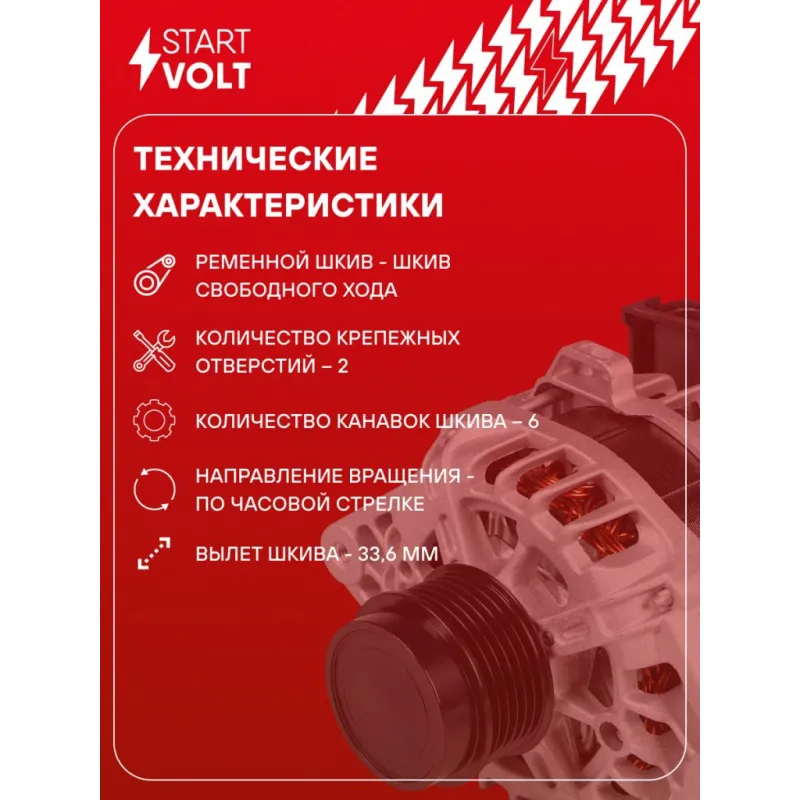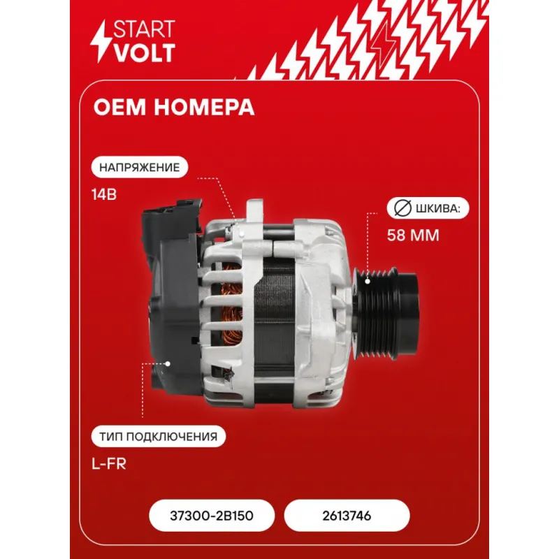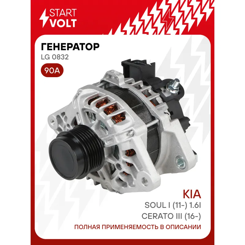 Генератор для автомобилей Kia Cerato III (16-)/Soul I (11-) 1.6i 90A Описание: Оригинальный генератор STARTVOLT LG 0832 рассчитан на ток 90 А и напряжение 14 В. Изготовлен аналогично оригинальной конструкции. Шкив свободного хода (6PK, диаметр 58 мм) полностью совместим с оригинальными агрегатами. Подходит для автомобилей: KIA CERATO, SOUL.. Если у вас есть вопросы по применяемости, мы всегда готовы помочь вам с подбором по VIN-НОМЕРУ ВАШЕГО АВТОМОБИЛЯ. Преимущества: - Полностью соответствует оригинальным узлам; - Высокоточная сборка с пооперационным контролем качества; - Каждый генератор проходит стендовое тестирование — протокол в комплекте; - Надёжность в любых условиях эксплуатации; - STARTVOLT 15 лет на рынке автоэлектрики — нам доверяют профессионалы; - Гарантия 2 года; - Сертифицирован по стандарту EAC (ЕАЭС) — соответствует требованиям безопасности и качества; Автомобильный генератор в сборе — готов к установке. Отличный выбор для надежной замены штатного генератора. Характеристики: Артикул: LG 0832 OEM номера: 37300-2B150, 2613746 Направление вращения: По часовой стрелке Выходной ток, А: 90 Напряжение, В: 14 Вылет шкива, мм: 33,6 Тип подключения: L-FR Диаметр шкива, мм: 58 Ременной шкив: с ременным шкивом свободного хода Количество крепежных отверстий: 2 Количество канавок шкива: 6 Комплектация: Паспорт изделия/гарантийный талон - 1 шт Индивидуальный технический паспорт изделия (с фирменным ID) - 1 шт Генератор - 1 шт Гарантия: от 1 года.
