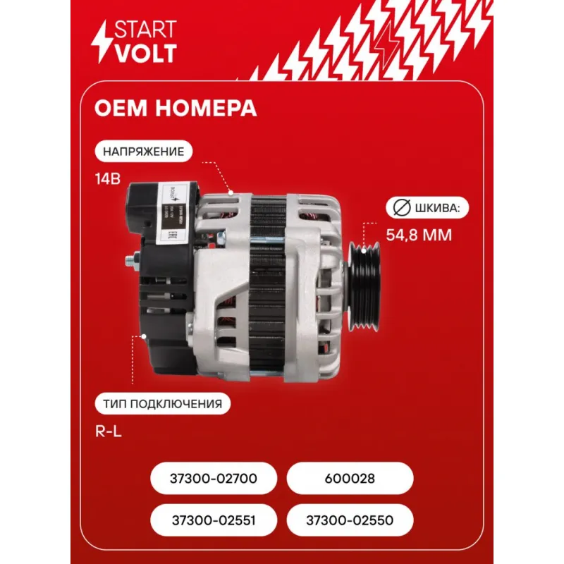 Генератор для автомобилей Kia Picanto (04-)/Hyundai Getz (02-) 1.1i 70A Описание: Оригинальный генератор STARTVOLT LG 0820 рассчитан на ток 70 А и напряжение 14 В. Изготовлен аналогично оригинальной конструкции. с многоручейковым ручейковым шкивом шкив (4PK, диаметр 54,8 мм) полностью совместим с оригинальными агрегатами. Подходит для автомобилей: HYUNDAI GETZ, ATOS, KIA PICANTO.. Если у вас есть вопросы по применяемости, мы всегда готовы помочь вам с подбором по VIN-НОМЕРУ ВАШЕГО АВТОМОБИЛЯ. Преимущества: - Полностью соответствует оригинальным узлам; - Высокоточная сборка с пооперационным контролем качества; - Каждый генератор проходит стендовое тестирование — протокол в комплекте; - Надёжность в любых условиях эксплуатации; - STARTVOLT 15 лет на рынке автоэлектрики — нам доверяют профессионалы; - Гарантия 2 года; - Сертифицирован по стандарту EAC (ЕАЭС) — соответствует требованиям безопасности и качества; Автомобильный генератор в сборе — готов к установке. Отличный выбор для надежной замены штатного генератора. Характеристики: Артикул: LG 0820 OEM номера: 37300-02551, 37300-02550, 37300-02700, 600028 Напряжение, В: 14 Выходной ток, А: 70 Тип подключения: R-L Диаметр шкива, мм: 54,8 Ременной шкив: с многоручейковым ручейковым шкивом Количество крепежных отверстий: 2 Количество канавок шкива: 4 Направление вращения: По часовой стрелке Вылет шкива, мм: 38,1 Подходит для авто: Hyundai Getz (02-) Kia Picanto (04-) Для проверки применяемости отправьте VIN автомобиля через вкладку "Есть вопросы о товаре?" Комплектация: Генератор - 1 шт Паспорт изделия/гарантийный талон - 1 шт Индивидуальный технический паспорт изделия (с фирменным ID) - 1 шт Гарантия: от 1 года.