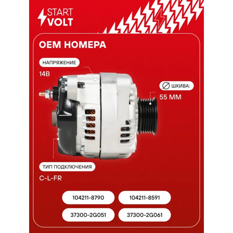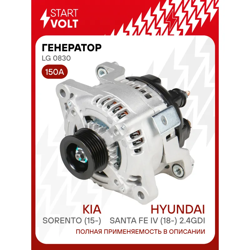 Генератор для автомобилей Kia Sorento (15-)/Hyundai Santa Fe IV (18-) 2.4GDI 150A Описание: Оригинальный генератор STARTVOLT LG 0830 рассчитан на ток 150 А и напряжение 14 В. Изготовлен аналогично оригинальной конструкции. с многоручейковым ручейковым шкивом шкив (6PK, диаметр 55 мм) полностью совместим с оригинальными агрегатами. Подходит для автомобилей: HYUNDAI SANTA FE, TUCSON, KIA SORENTO, OPTIMA.. Если у вас есть вопросы по применяемости, мы всегда готовы помочь вам с подбором по VIN-НОМЕРУ ВАШЕГО АВТОМОБИЛЯ. Преимущества: - Полностью соответствует оригинальным узлам; - Высокоточная сборка с пооперационным контролем качества; - Каждый генератор проходит стендовое тестирование — протокол в комплекте; - Надёжность в любых условиях эксплуатации; - STARTVOLT 15 лет на рынке автоэлектрики — нам доверяют профессионалы; - Гарантия 2 года; - Сертифицирован по стандарту EAC (ЕАЭС) — соответствует требованиям безопасности и качества; Автомобильный генератор в сборе — готов к установке. Отличный выбор для надежной замены штатного генератора. Характеристики: Артикул: LG 0830 OEM номера: 37300-2G051, 37300-2G061, 104211-8790, 104211-8591 Направление вращения: По часовой стрелке Выходной ток, А: 150 Напряжение, В: 14 Вылет шкива, мм: 43,5 Тип подключения: C-L-FR Диаметр шкива, мм: 55 Ременной шкив: с многоручейковым ручейковым шкивом Количество крепежных отверстий: 4 Количество канавок шкива: 6 Комплектация: Генератор - 1 шт Индивидуальный технический паспорт изделия (с фирменным ID) - 1 шт Паспорт изделия/гарантийный талон - 1 шт Гарантия: от 1 года.