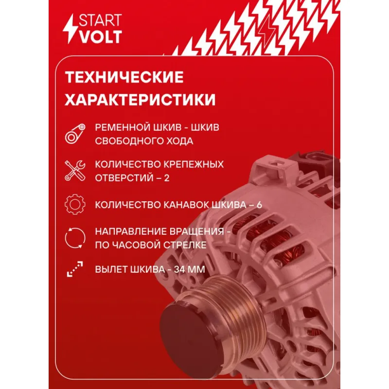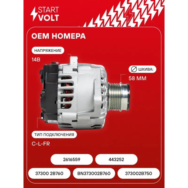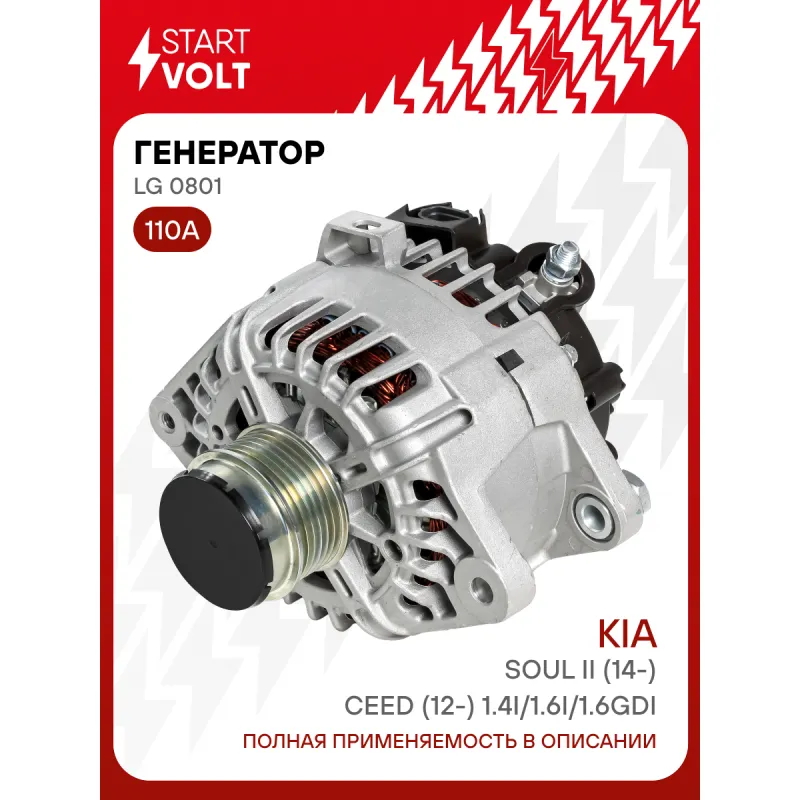 Генератор для автомобилей Kia Soul II (14-)/Ceed (12-) 1.4i/1.6i/1.6GDI 110A Описание: Оригинальный генератор STARTVOLT LG 0801 рассчитан на ток 110 А и напряжение 14 В. Изготовлен аналогично оригинальной конструкции. Шкив свободного хода (6PK, диаметр 58 мм) полностью совместим с оригинальными агрегатами. Подходит для автомобилей: HYUNDAI iX20, i40, VELOSTER, KIA CARENS, CEED, RIO, SOUL, VENGA.. Если у вас есть вопросы по применяемости, мы всегда готовы помочь вам с подбором по VIN-НОМЕРУ ВАШЕГО АВТОМОБИЛЯ. Преимущества: - Полностью соответствует оригинальным узлам; - Высокоточная сборка с пооперационным контролем качества; - Каждый генератор проходит стендовое тестирование — протокол в комплекте; - Надёжность в любых условиях эксплуатации; - STARTVOLT 15 лет на рынке автоэлектрики — нам доверяют профессионалы; - Гарантия 2 года; - Сертифицирован по стандарту EAC (ЕАЭС) — соответствует требованиям безопасности и качества; Автомобильный генератор в сборе — готов к установке. Отличный выбор для надежной замены штатного генератора. Характеристики: Артикул: LG 0801 OEM номера: 37300 2B760, 2616559, 443252, BN373002B760, 373002B750 Напряжение, В: 14 Выходной ток, А: 110 Тип подключения: C-L-FR Диаметр шкива, мм: 58 Ременной шкив: с ременным шкивом свободного хода Количество крепежных отверстий: 2 Количество канавок шкива: 6 Направление вращения: По часовой стрелке Вылет шкива, мм: 34 Сопутствующий товар: Регуляторы напряжения генераторов: VRR 08L5 Сопутствующий товар: Шкивы генераторов с обгонной муфтой: SGP 0822 Комплектация: Индивидуальный технический паспорт изделия (с фирменным ID) - 1 шт Паспорт изделия/гарантийный талон - 1 шт Генератор - 1 шт Гарантия: от 1 года.