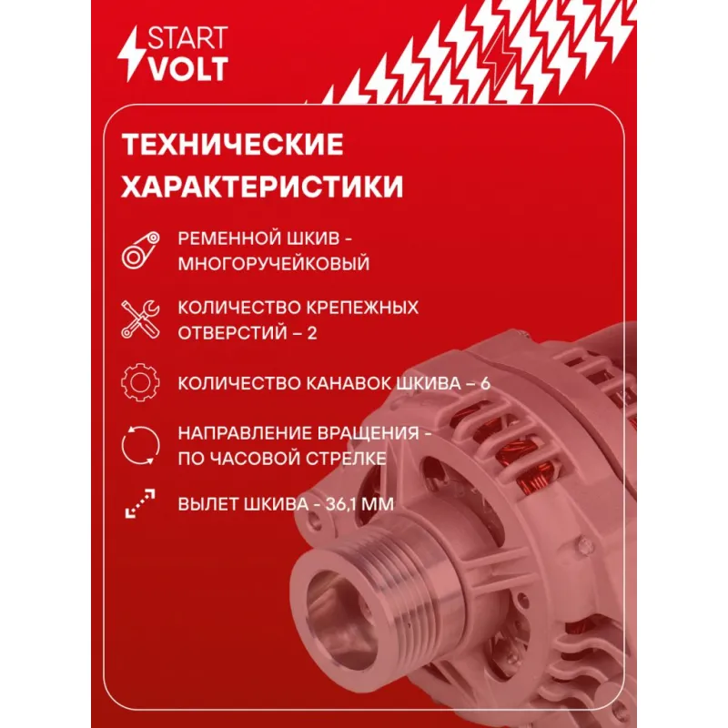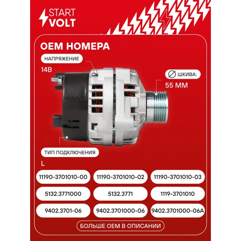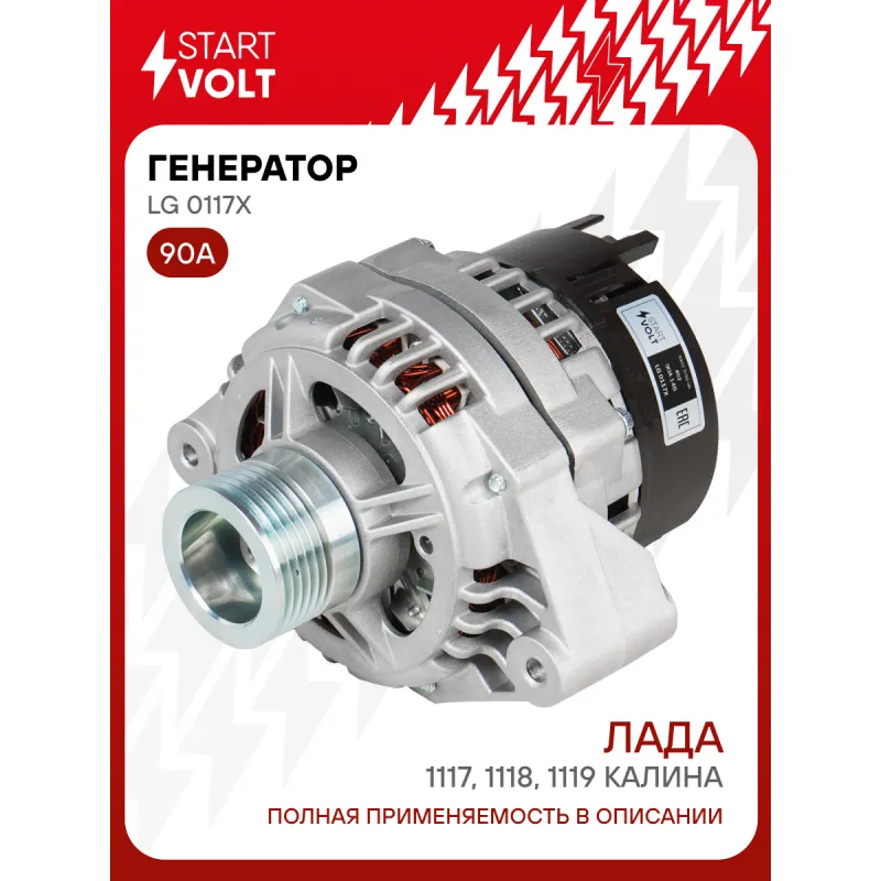 Генератор для автомобилей Лада 1117/1118/1119 Калина 90А Описание: Оригинальный генератор STARTVOLT LG 0117X рассчитан на ток 90 А и напряжение 14 В. Изготовлен аналогично оригинальной конструкции. с многоручейковым ручейковым шкивом шкив (6PK, диаметр 55 мм) полностью совместим с оригинальными агрегатами. Подходит для автомобилей: LADA KALINA, LARGUS, GRANTA.. Если у вас есть вопросы по применяемости, мы всегда готовы помочь вам с подбором по VIN-НОМЕРУ ВАШЕГО АВТОМОБИЛЯ. Преимущества: - Полностью соответствует оригинальным узлам; - Высокоточная сборка с пооперационным контролем качества; - Каждый генератор проходит стендовое тестирование — протокол в комплекте; - Надёжность в любых условиях эксплуатации; - STARTVOLT 15 лет на рынке автоэлектрики — нам доверяют профессионалы; - Гарантия 2 года; - Сертифицирован по стандарту EAC (ЕАЭС) — соответствует требованиям безопасности и качества; Автомобильный генератор в сборе — готов к установке. Отличный выбор для надежной замены штатного генератора. Характеристики: Артикул: LG 0117X OEM номера: 9402.3701-06, 9402.3701000-06, 9402.3701000-06А, 5132.3771000, 5132.3771, 1119-3701010, 11190-3701010-00, 11190-3701010-02, 11190-3701010-03, 1118-3701010 Напряжение, В: 14 Выходной ток, А: 90 Тип подключения: L Диаметр шкива, мм: 55 Ременной шкив: с многоручейковым ручейковым шкивом Количество крепежных отверстий: 2 Количество канавок шкива: 6 Направление вращения: По часовой стрелке Вылет шкива, мм: 36,1 Сопутствующий товар: Регуляторы напряжения генераторов: VRR 0117X Сопутствующий товар: Мосты диодные генераторов: VDB 0117X Подходит для авто: ВАЗ Kalina (04-), Kalina II (13-) Для проверки применяемости отправьте VIN автомобиля через вкладку "Есть вопросы о товаре?" Комплектация: Генератор - 1 шт Индивидуальный технический паспорт изделия (с фирменным ID) - 1 шт Паспорт изделия/гарантийный талон - 1 шт Гарантия: от 1 года.
