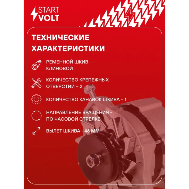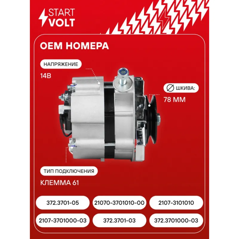 Генератор для автомобилей Лада 2104-2107/21045 с инж. двиг. (после 2007г.) 73А Описание: Оригинальный генератор STARTVOLT LG 0107X рассчитан на ток 73 А и напряжение 14 В. Изготовлен аналогично оригинальной конструкции. с ремённым шкивом шкив (диаметр 78 мм) полностью совместим с оригинальными агрегатами. Подходит для автомобилей: LADA ВАЗ 2101-2107, SAMARA, ZAZ 966/968/968M.. Если у вас есть вопросы по применяемости, мы всегда готовы помочь вам с подбором по VIN-НОМЕРУ ВАШЕГО АВТОМОБИЛЯ. Преимущества: - Полностью соответствует оригинальным узлам; - Высокоточная сборка с пооперационным контролем качества; - Каждый генератор проходит стендовое тестирование — протокол в комплекте; - Надёжность в любых условиях эксплуатации; - STARTVOLT 15 лет на рынке автоэлектрики — нам доверяют профессионалы; - Гарантия 2 года; - Сертифицирован по стандарту EAC (ЕАЭС) — соответствует требованиям безопасности и качества; Автомобильный генератор в сборе — готов к установке. Отличный выбор для надежной замены штатного генератора. Характеристики: Артикул: LG 0107X OEM номера: 2107-3701000-03, 372.3701-03, 372.3701000-03, 372.3701-05, 21070-3701010-00, 2107-3101010 Напряжение, В: 14 Выходной ток, А: 73 Тип подключения: Клемма 61 Диаметр шкива, мм: 78 Ременной шкив: с ремённым шкивом Количество крепежных отверстий: 2 Количество канавок шкива: 1 Направление вращения: По часовой стрелке Вылет шкива, мм: 46 Сопутствующий товар: Регуляторы напряжения генераторов: VRR 0108 Сопутствующий товар: Мосты диодные генераторов: VDB 0108X Подходит для авто: ВАЗ 2109, 21099, 2104i, 2105i, 2107i, 2108 Для проверки применяемости отправьте VIN автомобиля через вкладку "Есть вопросы о товаре?" Комплектация: Индивидуальный технический паспорт изделия (с фирменным ID) - 1 шт Паспорт изделия/гарантийный талон - 1 шт Генератор - 1 шт Гарантия: от 1 года.