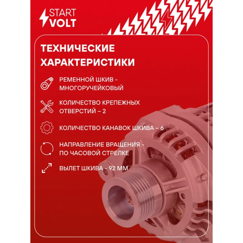 Генератор для автомобилей Лада 2110-2112/2170-2172 с комб.пр.с 2004г. 80A Описание: Оригинальный генератор STARTVOLT LG 0111X рассчитан на ток 80 А и напряжение 14 В. Изготовлен аналогично оригинальной конструкции. с многоручейковым ручейковым шкивом шкив (6PK, диаметр 55 мм) полностью совместим с оригинальными агрегатами. Подходит для автомобилей: LADA ВАЗ 2110-2112, PRIORA, SAMARA.. Если у вас есть вопросы по применяемости, мы всегда готовы помочь вам с подбором по VIN-НОМЕРУ ВАШЕГО АВТОМОБИЛЯ. Преимущества: - Полностью соответствует оригинальным узлам; - Высокоточная сборка с пооперационным контролем качества; - Каждый генератор проходит стендовое тестирование — протокол в комплекте; - Надёжность в любых условиях эксплуатации; - STARTVOLT 15 лет на рынке автоэлектрики — нам доверяют профессионалы; - Гарантия 2 года; - Сертифицирован по стандарту EAC (ЕАЭС) — соответствует требованиям безопасности и качества; Автомобильный генератор в сборе — готов к установке. Отличный выбор для надежной замены штатного генератора. Характеристики: Артикул: LG 0111X OEM номера: 9402.3701000-03, 9402.3701-03 Направление вращения: По часовой стрелке Выходной ток, А: 80 Напряжение, В: 14 Вылет шкива, мм: 92 Тип подключения: D+ Диаметр шкива, мм: 55 Ременной шкив: с многоручейковым ручейковым шкивом Количество крепежных отверстий: 2 Количество канавок шкива: 6 Комплектация: Индивидуальный технический паспорт изделия (с фирменным ID) - 1 шт Паспорт изделия/гарантийный талон - 1 шт Генератор - 1 шт Гарантия: от 1 года.