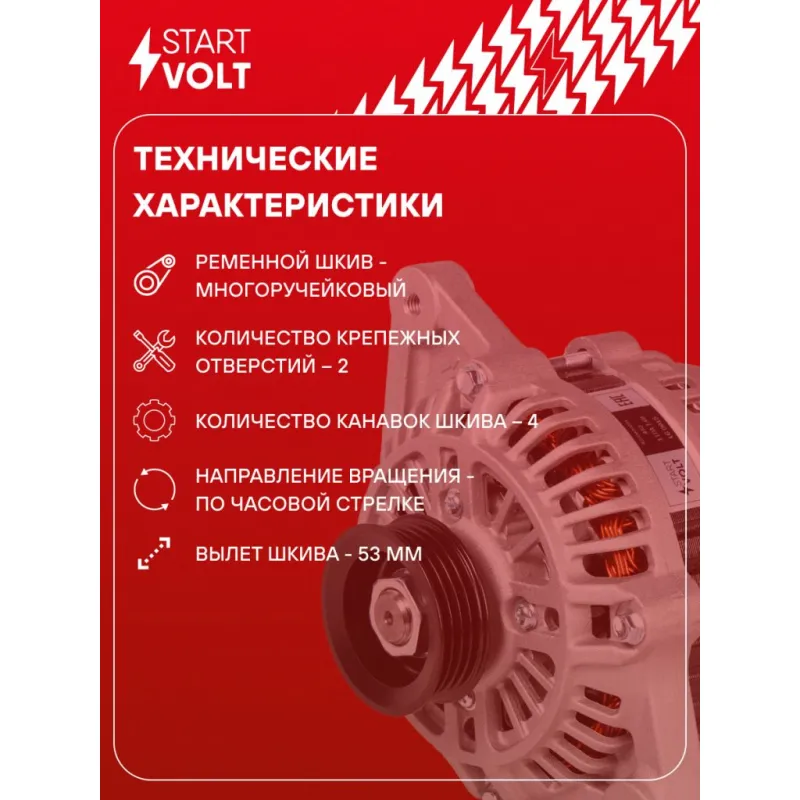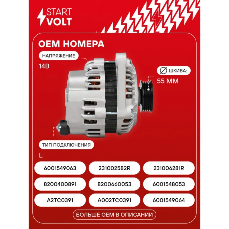 Генератор для автомобилей Лада Largus (12-)/Renault Logan (04-) 1.4i/1.6i (тип Mitsubishi) 110А Описание: Оригинальный генератор STARTVOLT LG 0915 рассчитан на ток 110 А и напряжение 14 В. Изготовлен аналогично оригинальной конструкции тип Mitsubishi. с многоручейковым ручейковым шкивом шкив (4PK, диаметр 55 мм) полностью совместим с оригинальными агрегатами. Подходит для автомобилей: DACIA LOGAN, SANDERO, LADA LARGUS, RENAULT LOGAN, SANDERO / STEPWAY.. Если у вас есть вопросы по применяемости, мы всегда готовы помочь вам с подбором по VIN-НОМЕРУ ВАШЕГО АВТОМОБИЛЯ. Преимущества: - Полностью соответствует оригинальным узлам; - Высокоточная сборка с пооперационным контролем качества; - Каждый генератор проходит стендовое тестирование — протокол в комплекте; - Надёжность в любых условиях эксплуатации; - STARTVOLT 15 лет на рынке автоэлектрики — нам доверяют профессионалы; - Гарантия 2 года; - Сертифицирован по стандарту EAC (ЕАЭС) — соответствует требованиям безопасности и качества; Автомобильный генератор в сборе — готов к установке. Отличный выбор для надежной замены штатного генератора. Характеристики: Артикул: LG 0915 OEM номера: A2TC0391, A002TC0391, 6001549064, 8200400891, 8200660053, 6001548053, 8200232061, 7711368054 Напряжение, В: 14 Выходной ток, А: 110 Тип подключения: L Диаметр шкива, мм: 55 Ременной шкив: с многоручейковым ручейковым шкивом Количество крепежных отверстий: 2 Количество канавок шкива: 4 Направление вращения: По часовой стрелке Вылет шкива, мм: 53 Сопутствующий товар: Регуляторы напряжения генераторов: VRR 0915 Сопутствующий товар: Мосты диодные генераторов: VDB 0915 Подходит для авто: Renault Sandero I (09-), Logan (08-) ВАЗ Largus (12-) Для проверки применяемости отправьте VIN автомобиля через вкладку "Есть вопросы о товаре?" Комплектация: Генератор - 1 шт Индивидуальный технический паспорт изделия (с фирменным ID) - 1 шт Паспорт изделия/гарантийный талон - 1 шт Гарантия: от 1 года.