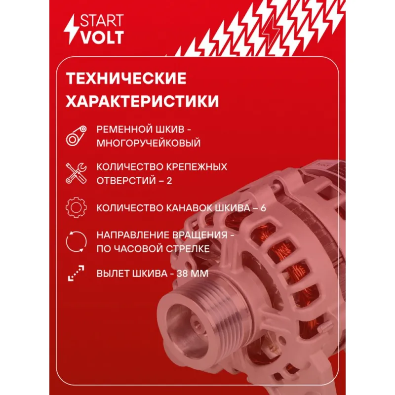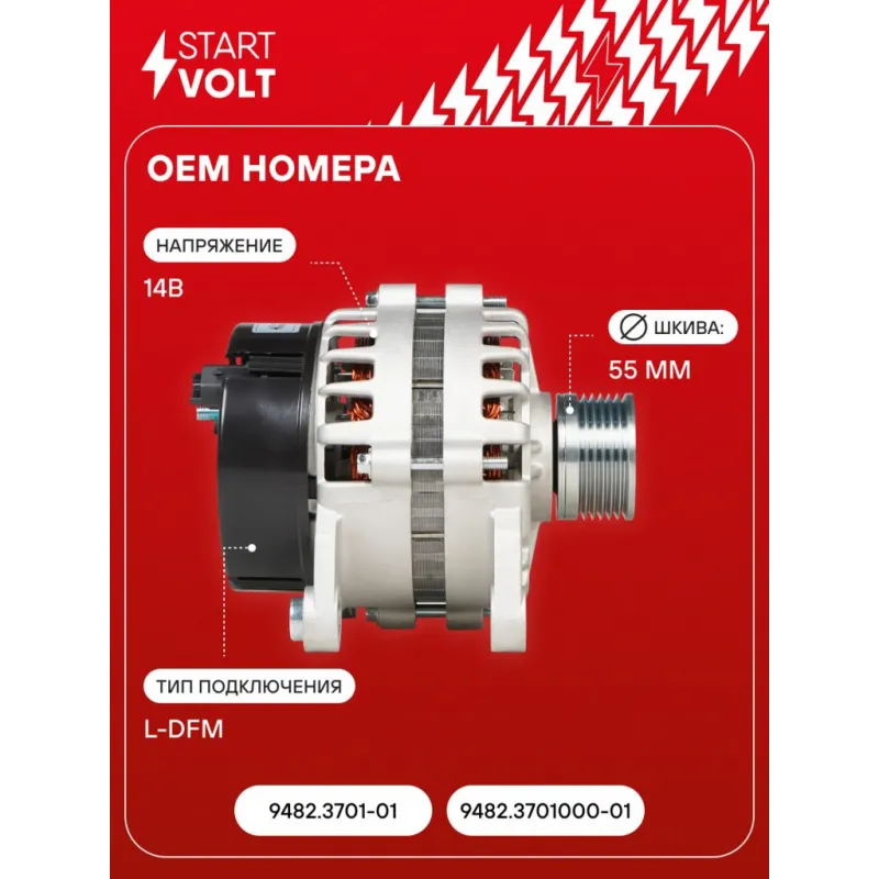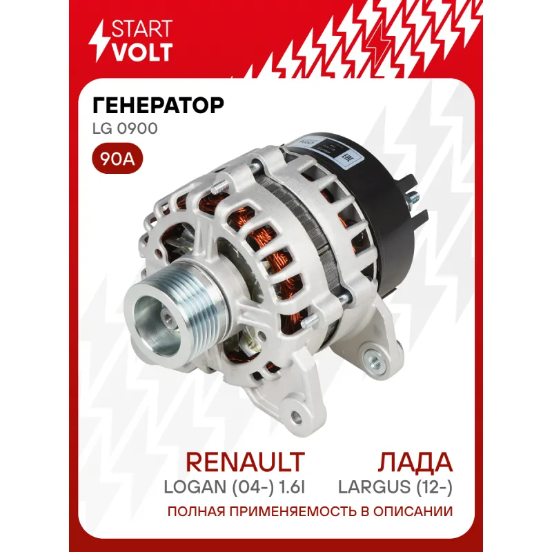 Генератор для автомобилей Лада Largus (12-)/Renault Logan (04-) 1.6i 90A (тип АвтоВАЗ) Описание: Оригинальный генератор STARTVOLT LG 0900 рассчитан на ток 90 А и напряжение 14 В. Изготовлен аналогично оригинальной конструкции тип АвтоВАЗ. с многоручейковым ручейковым шкивом шкив (6PK, диаметр 55 мм) полностью совместим с оригинальными агрегатами. Подходит для автомобилей: DACIA DUSTER, LOGAN, SANDERO, LADA LARGUS, RENAULT LOGAN, SANDERO / STEPWAY, DUSTER.. Если у вас есть вопросы по применяемости, мы всегда готовы помочь вам с подбором по VIN-НОМЕРУ ВАШЕГО АВТОМОБИЛЯ. Преимущества: - Полностью соответствует оригинальным узлам; - Высокоточная сборка с пооперационным контролем качества; - Каждый генератор проходит стендовое тестирование — протокол в комплекте; - Надёжность в любых условиях эксплуатации; - STARTVOLT 15 лет на рынке автоэлектрики — нам доверяют профессионалы; - Гарантия 2 года; - Сертифицирован по стандарту EAC (ЕАЭС) — соответствует требованиям безопасности и качества; Автомобильный генератор в сборе — готов к установке. Отличный выбор для надежной замены штатного генератора. Характеристики: Артикул: LG 0900 OEM номера: 9482.3701-01, 9482.3701000-01 Напряжение, В: 14 Выходной ток, А: 90 Тип подключения: L-DFM Диаметр шкива, мм: 55 Ременной шкив: с многоручейковым ручейковым шкивом Количество крепежных отверстий: 2 Количество канавок шкива: 6 Направление вращения: По часовой стрелке Вылет шкива, мм: 38 Сопутствующий товар: Регуляторы напряжения генераторов: VRR 0900 Сопутствующий товар: Мосты диодные генераторов: VDB 0900 Подходит для авто: Renault Sandero I (09-), Logan (04-), Duster (10-) Dacia Sandero (08-), Logan (04-), Duster (10-) ВАЗ Largus (12-) Для проверки применяемости отправьте VIN автомобиля через вкладку "Есть вопросы о товаре?" Комплектация: Генератор - 1 шт Индивидуальный технический паспорт изделия (с фирменным ID) - 1 шт Паспорт изделия/гарантийный талон - 1 шт Гарантия: от 1 года.
