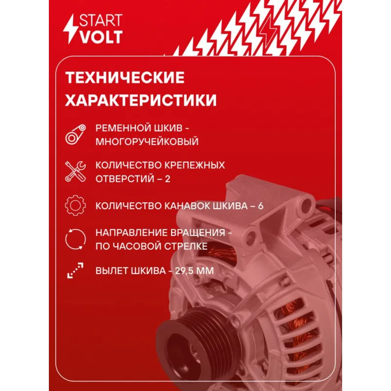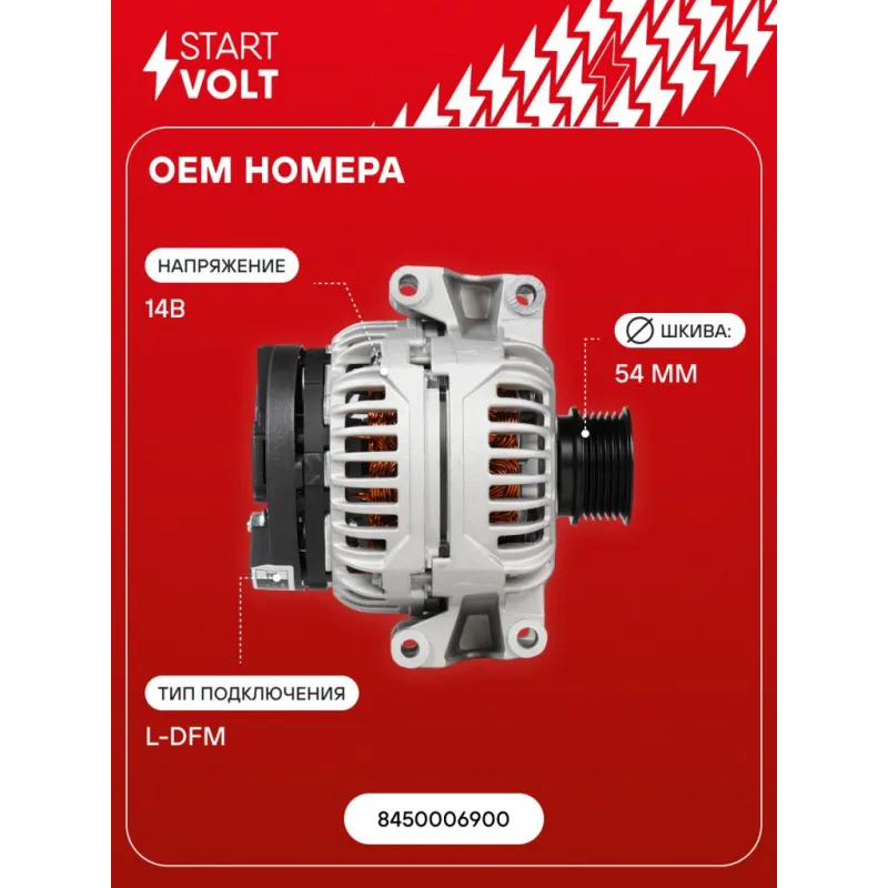 Генератор для автомобилей Лада Vesta (15-)/XRay (15-) 1.6i 140A (в комплекте с предохранителями 80А) Описание: Оригинальный генератор STARTVOLT LG 0180 рассчитан на ток 140 А и напряжение 14 В. Изготовлен аналогично оригинальной конструкции. с многоручейковым ручейковым шкивом шкив (6PK, диаметр 54 мм) полностью совместим с оригинальными агрегатами. Подходит для автомобилей: HONDA VEZEL, LADA VESTA, XRAY.. Если у вас есть вопросы по применяемости, мы всегда готовы помочь вам с подбором по VIN-НОМЕРУ ВАШЕГО АВТОМОБИЛЯ. Преимущества: - Полностью соответствует оригинальным узлам; - Высокоточная сборка с пооперационным контролем качества; - Каждый генератор проходит стендовое тестирование — протокол в комплекте; - Надёжность в любых условиях эксплуатации; - STARTVOLT 15 лет на рынке автоэлектрики — нам доверяют профессионалы; - Гарантия 2 года; - Сертифицирован по стандарту EAC (ЕАЭС) — соответствует требованиям безопасности и качества; Автомобильный генератор в сборе — готов к установке. Отличный выбор для надежной замены штатного генератора. Характеристики: Артикул: LG 0180 OEM номера: 8450006900 Напряжение, В: 14 Выходной ток, А: 140 Тип подключения: L-DFM Диаметр шкива, мм: 54 Ременной шкив: с многоручейковым ручейковым шкивом Количество крепежных отверстий: 2 Количество канавок шкива: 6 Направление вращения: По часовой стрелке Вылет шкива, мм: 29,5 Сопутствующий товар: Регуляторы напряжения генераторов: VRR 1650 Подходит для авто: ВАЗ Vesta (15-), Vesta (15-), X-Ray (15-) Для проверки применяемости отправьте VIN автомобиля через вкладку "Есть вопросы о товаре?" Комплектация: Предохранитель - 2 шт Паспорт изделия/гарантийный талон - 1 шт Генератор - 1 шт Индивидуальный технический паспорт изделия (с фирменным ID) - 1 шт Гарантия: от 1 года.