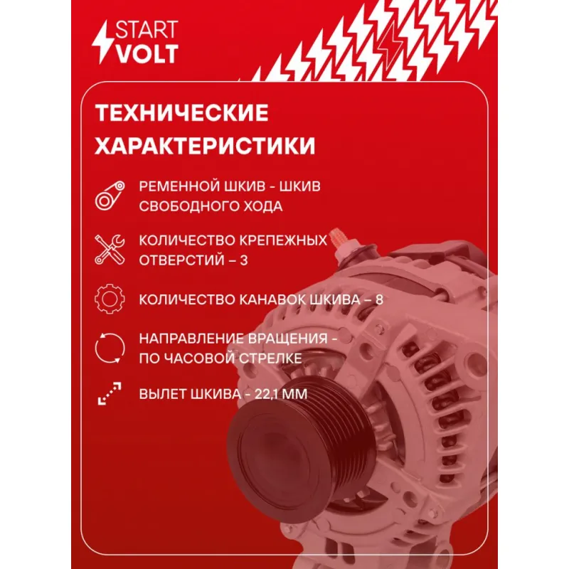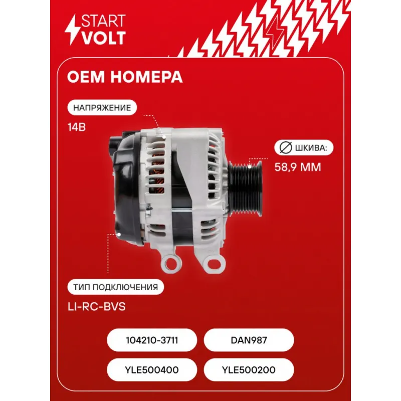 Генератор для автомобилей Land Rover Discovery III (04-) 2.7TD 150A Описание: Оригинальный генератор STARTVOLT LG 1053 рассчитан на ток 150 А и напряжение 14 В. Изготовлен аналогично оригинальной конструкции. Шкив свободного хода (8PK, диаметр 58,9 мм) полностью совместим с оригинальными агрегатами. Подходит для автомобилей: LAND ROVER DISCOVERY, RANGE ROVER SPORT.. Если у вас есть вопросы по применяемости, мы всегда готовы помочь вам с подбором по VIN-НОМЕРУ ВАШЕГО АВТОМОБИЛЯ. Преимущества: - Полностью соответствует оригинальным узлам; - Высокоточная сборка с пооперационным контролем качества; - Каждый генератор проходит стендовое тестирование — протокол в комплекте; - Надёжность в любых условиях эксплуатации; - STARTVOLT 15 лет на рынке автоэлектрики — нам доверяют профессионалы; - Гарантия 2 года; - Сертифицирован по стандарту EAC (ЕАЭС) — соответствует требованиям безопасности и качества; Автомобильный генератор в сборе — готов к установке. Отличный выбор для надежной замены штатного генератора. Характеристики: Артикул: LG 1053 OEM номера: YLE500400, YLE500200, 104210-3711, DAN987 Направление вращения: По часовой стрелке Выходной ток, А: 150 Напряжение, В: 14 Вылет шкива, мм: 22,1 Тип подключения: LI-RC-BVS Диаметр шкива, мм: 58,9 Ременной шкив: с ременным шкивом свободного хода Количество крепежных отверстий: 3 Количество канавок шкива: 8 Комплектация: Паспорт изделия/гарантийный талон - 1 шт Индивидуальный технический паспорт изделия (с фирменным ID) - 1 шт Генератор - 1 шт Гарантия: от 1 года.